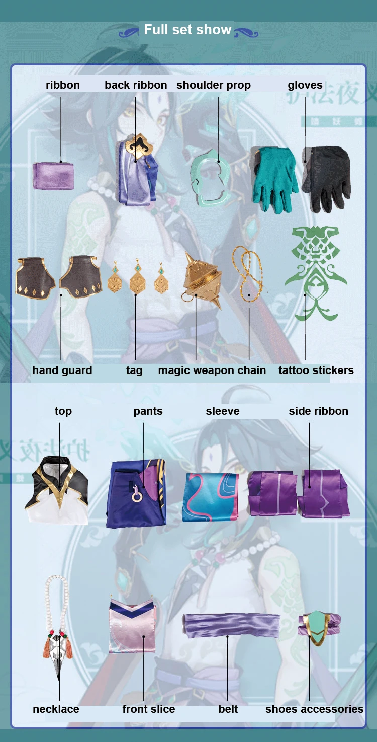Включает: топ + штаны + рукав + боковая лента + ожерелье + передний ломтик + ремень + аксессуары для обуви + лента + Задняя лента + опора на плечо + перчатки + защита рук + бирка + волшебная цепь для оружия + тату-наклейки,Обувь продается отдельно (пожалуйста, сообщите нам вашу обувь).