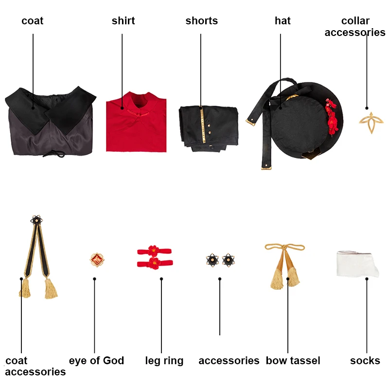 В комплект входит: пальто + рубашка + шорты + шапка + аксессуары для воротника + аксессуары для пальто + око Божия + кольцо для ног + кисточка с бантом + носки