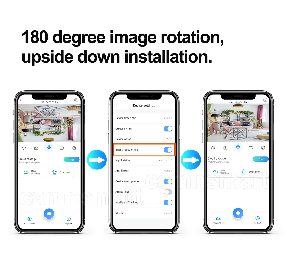 Изображение камеры по-прежнему является правильным даже при установке вверх дном, просто перейдите в приложение, чтобы настроить поворот на 180 °.