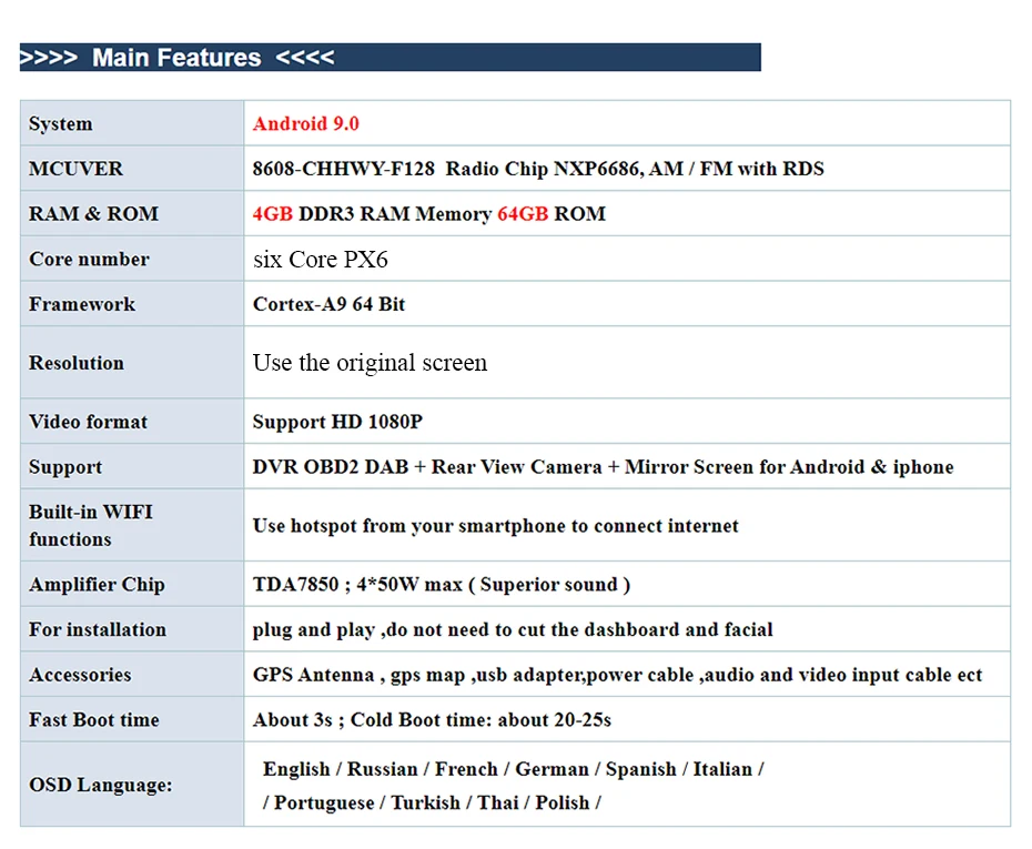 Примечание: для нашего головного устройства не поддерживайте, как показано ниже: iPod, Оригинальная Автомобильная GPS антенна, оригинальная автомобильная задняя камера, оригинальный автомобильный bluetooth, оригинальный автомобильный USB, а также оригинальный автомобильный микрофон. Пожалуйста, не обновляйте ROM f rom Malaysk на forum xda-developers или обновляйте другие брендовые приложения, которые не предоставляют f rom us. Потому что этот вид действий повредит головное устройство. Если вы обновите его самостоятельно, вы столкнетесь с такими проблемами, как не можете обновить ваш marshmallow больше, и вы потеряете сервис гарантии головного блока О доставке1. Если есть таможенные пошлины, покупатели должны оплатить их. Если у вас есть специальный запрос, пожалуйста, свяжитесь с нами, когда вы делаете заказ.2. Импортные пошлины, налоги и сборы не включены в стоимость товара или стоимость доставки.3. Плата за удаленную область исключена, для адресов, перечисленных в отдаленных районах на веб-сайте DHL/Fedex, будет взиматься дополнительная $30 США4. Обычно мы используем DHL и EMS. Если вы можете выбрать DHL, мы рекомендуем вам использовать его. Если вы предпочитаете другую экспресс-доставку, пожалуйста, свяжитесь с нами вовремя. Пожалуйста, дайте нам свой (мобильный) номер телефона во время оформления заказа для доставки, это очень важно.Все посылки будут отправлены в течение 1-3 дней, как правило, после получения оплаты (за исключением выходных и праздничных дней) Гарантия и возвратВсе наши товары проходят проверку 4 раза, чтобы подтвердить работоспособность должным образом перед отправкой и приходят с 12-месячной пожалуйста, будьте уверены, купите у нас. Гарантия не будет покрывать ущерб от неправильной установки, несчастного случая, неправильного использования, неправильного использования, неправильной проводки и неправильного напряжения, работающего на устройстве, в соответствии с инструкциями, приведенными в руководстве владельца.Время проверки для замены составляет 14 дней с даты получения товара, если у этого товара есть какие-либо проблемы при прибытии, пожалуйста, свяжитесь с нами и обратите внимание, что он находится в первоначальном состоянии.Покупатель несет ответственность за оплату почтовых расходов и отправку товара обратно к нам. Пожалуйста, сообщите нам причину отзыва вашего заказа и отправьте нам четкое изображение или видео в качестве доказательства. Товары, возвращенные нам без отчета, не будут обработаны. Установка:Пожалуйста, просто установите этот блок профессиональным техником, также попросите их проверить его перед установкойПеред отправкой мы тщательно проверили все наши товары, если вы получили сломанный дефектный товар, Просто сохраните оригинальную посылка и сделайте фотографию нам в течение 3 дней Примечание:Сборы за установку не контролируются нами, они должны быть оплачены покупателем.Цена не включает НДС и таможенный налог, если возникают какие-либо сборы, покупатель должен оплатить их самостоятельноПокупатель несет ответственность за транспортные расходы, связанные с возвратом товаров Отзывы:Мы установили автоматическую систему для отзывы, когда получите ваши отзывы; Она даст вам такую же автоматическую, она будет оценена, если вы можете оставить нам положительный отзывы с 5 звездами, это ободрение для нас, и мы сделаем вс