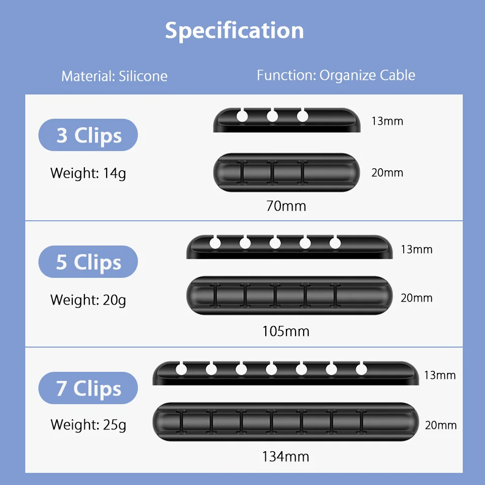 * Этот силиконовый Кабельный органайзер достаточно хорош, чтобы держать все ваши Грязные Кабели организованными и доступными в нужном вам положении* Гибкий и мягкий силикон защищает кабели от сдавливания, метод открытия пресс-типа очень легко зажимать и ослаблять* Двусторонний клей очень прочный и долговечный, хорошо работает на гладкой и чистой поверхности, такой как дерево, стекло, металл, пластик, кожа и мрамор