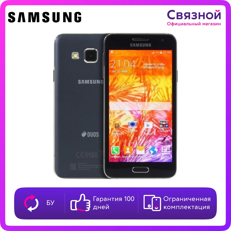 Обратите внимание: этот смартфон был в употреблении. В комплектацию входит только сам аппарат, без аксессуаров.Состояние хорошее. Смартфон активно использовали, но устройство исправно, все функции работают. Недостатки касаются только внешнего вида и их легко скрывают чехлы и стекла. На смартфон предоставляется гарантия 100 дней.МЕТАЛЛИЧЕСКИЙ СМАРТФОН В ЦВЕТНОМ КОРПУСЕSamsung Galaxy A3 – первый смартфон Samsung с металлическим корпусом, который отличается роскошным инновационным дизайном и великолепным 4,5-дюймовым sAMOLED экраном. Ощущение настоящего металла особенно чувствуется, когда вы держите в руке этот смартфон. Шесть цветов на выбор означают, что вы сможете подобрать модель Samsung Galaxy A3, наиболее точно отвечающую вашему вкусу и стилю.РЕЖИМ СЪЕМКИ СЕЛФИ СТАЛ ЕЩЕ УМНЕЕВаши вытянутые вперед руки при съемке селфи еще не означают, что снимок испорчен. При съемке селфи смартфоном Samsung Galaxy A3 вам не нужно касаться кнопки. Снимайте селфи с помощью голосовой команды или жеста рукой, и пусть ваши друзья думают, что вас снимал персональный фотограф. Благодаря новейшей версии ПО для распознавания изображений и голоса, съемка селфи с помощью Samsung Galaxy A3 поднялась на новый, более высокий уровень.ШИРОКОУГОЛЬНЫЕ СЕЛФИ С ДРУЗЬЯМИУ вас много друзей? Теперь вы сможете все вместе уместиться на одной фотографии! Новый режим широкоугольного селфи позволяет создавать селфи панорамного типа путем объединения трех снимков, сделанных слева, в центре и справа. Теперь вы можете сделать снимок селфи с углом охвата 110° в портретной ориентации камеры или 120° в альбомной. А функции авторедактирования помогут сделать каждый снимок профессиональным.АДАПТИВНЫЙ ЭКРАН И ЗВУКТехнологии Alive Super AMOLED Display и Adapt Display настроят параметры изображения на экране так, что оно будет выглядеть совершенно естественным. Функция автоматической настройки звука (Adjustable Audio) смартфона позволит автоматически увеличить или уменьшить громкость в зависимости от уровня внешнего звукового фона.ВЫСОКАЯ ПРОИЗВОДИТЕЛЬНОСТЬSamsung Galaxy A3, оснащенный 1,2 ГГц четырехъядерным процессором, отличается высокой производительностью и мгновенной реакцией на ваши действия. Плавное воспроизведение видео, высокое качество музыки и поддержка многозадачности – отличительные особенности устройства. Благодаря поддержке LTE Cat 4, вы сможете легко загружать любой контент, намного быстрее, чем раньше.РЕЖИМ МАКСИМАЛЬНОГО ЭНЕРГОСБЕРЕЖЕНИЯТеперь вы не пропустите важных звонков из-за разряженного аккумулятора. Режим энергосбережения Ultra Power Saving mode существенно снижает энергопотребление за счет отключения лишних возможностей и сохранения только жизненно необходимых на данный момент функций. Умная батарея для умного смартфона.