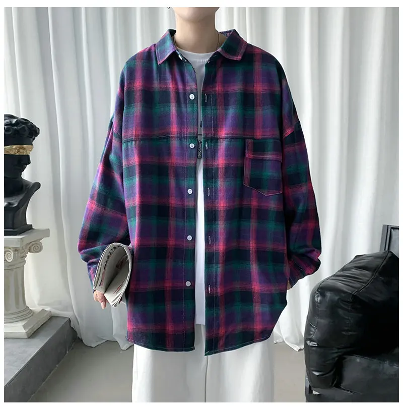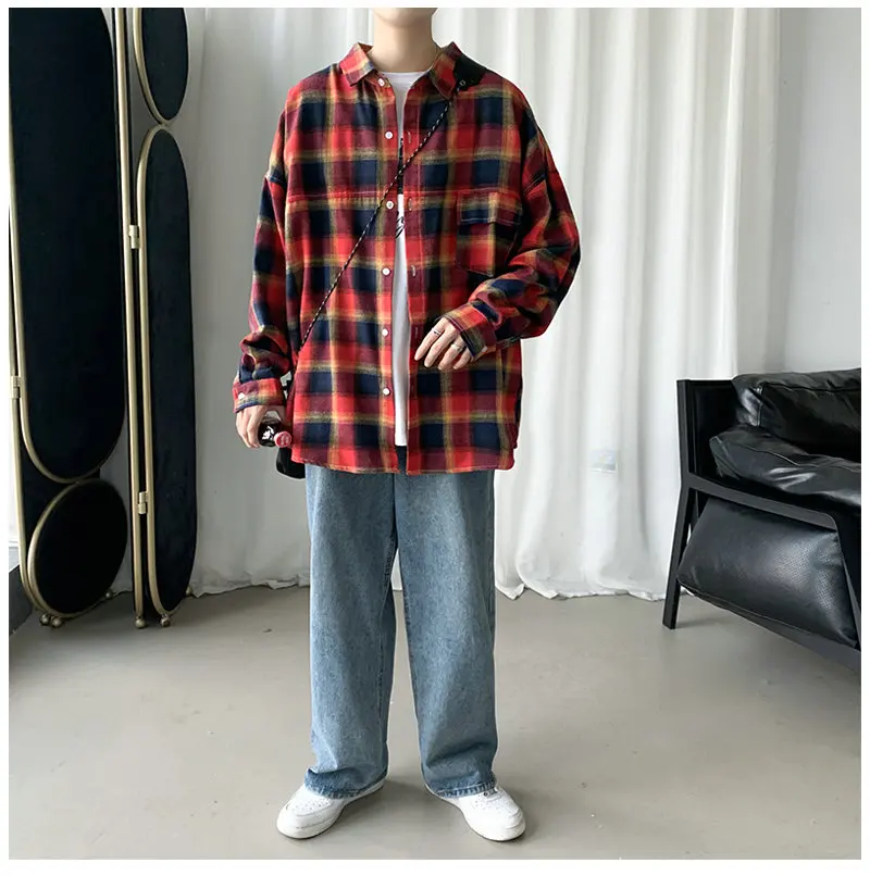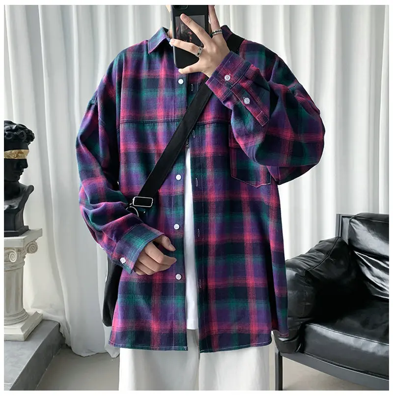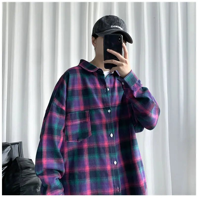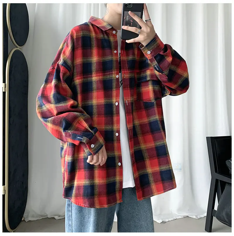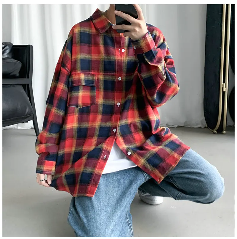 Рубашка в клетку с длинным рукавом для мужчин и женщин, свободная повседневная рубашка оверсайз в стиле Харадзюку, 2021