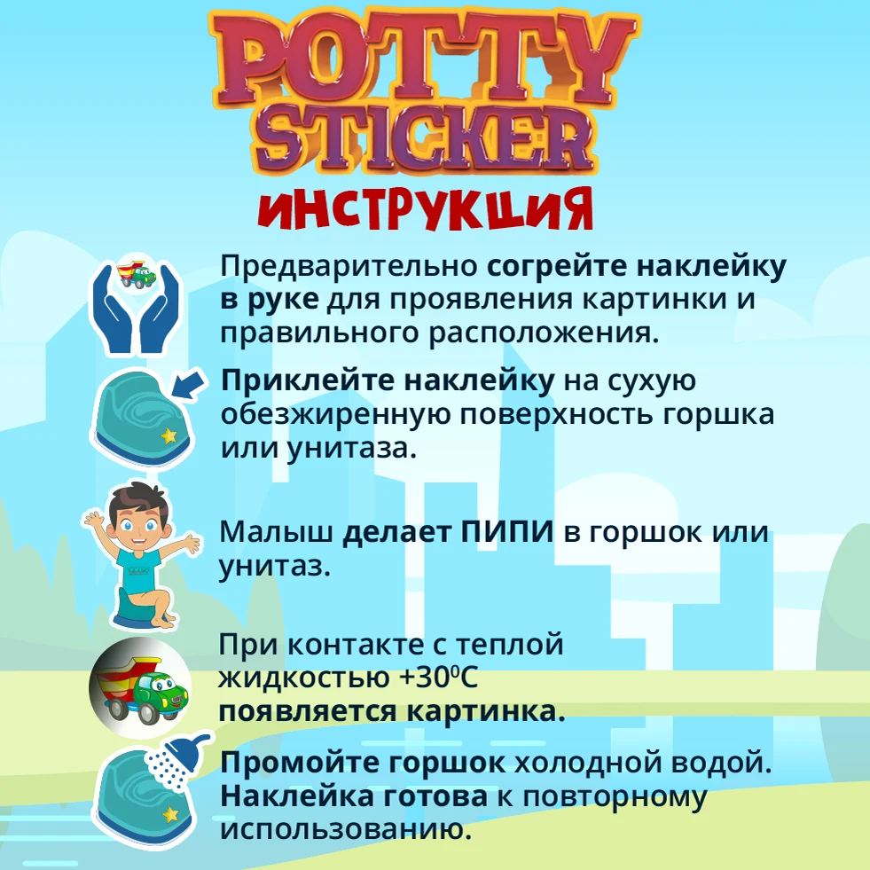 Как работает обучающая наклейка Potty Sticker: при попадании теплой жидкости на наклейку появляется веселая картинка, которая исчезает после высыхания (или ополаскивания под холодной водой) и снова появляется при контакте с теплой жидкостью. СОСТАВ: 100% термовинил, не впитывает запахи. Срок действия одной наклейки20 недель. Подходит для всех типов горшков.