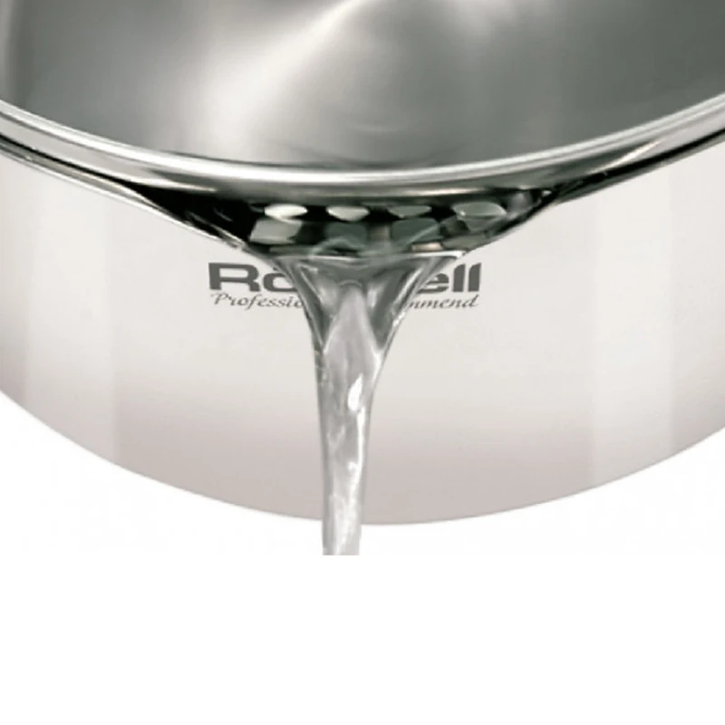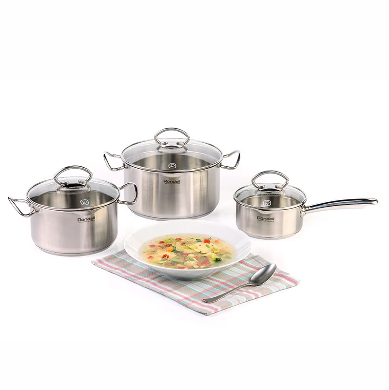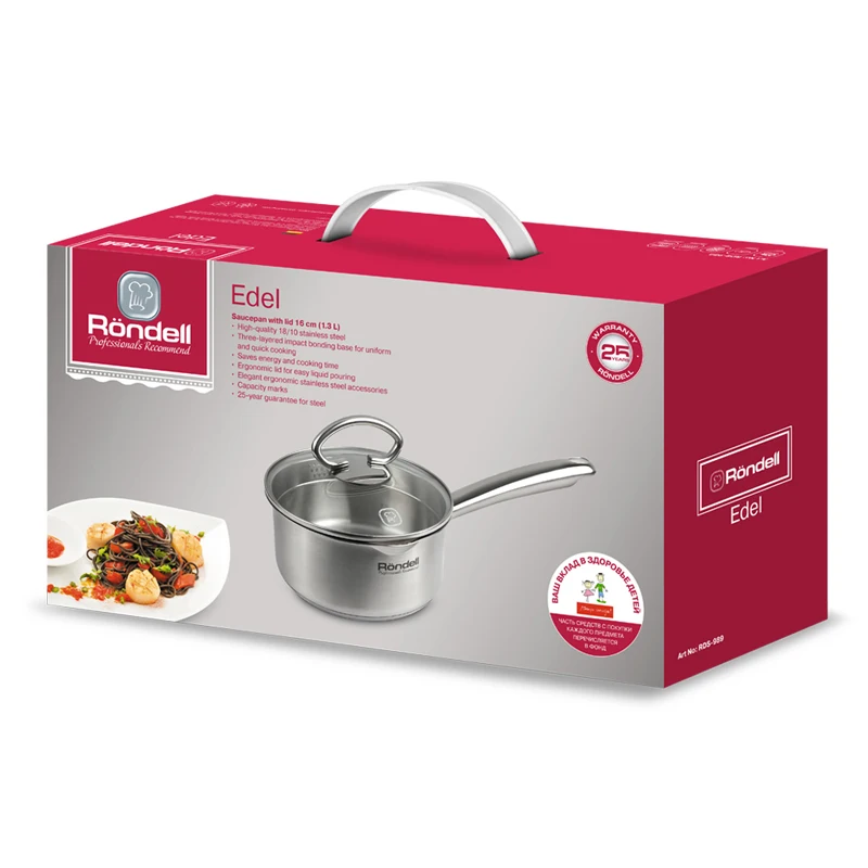 Едва ли не каждая хозяйка нет-нет да и пожалуется, что в процессе приготовления блюда приходится использовать лишние тарелки для ложки или половника. Выход из такой ситуации нашли дизайнеры Röndell, спроектировавшие уникальную коллекцию Edel: изящные стальные (потому очень надежные!) ручки кастрюль могут служить своеобразными подставками для кухонных аксессуаров. Заметим, что готовить в этой посуде очень приятно, так как результат всегда превосходит ожидания. Дело в том, что кастрюли имеют тройное вштампованное, а затем вплавленное дно, гарантирующее равномерное распределение тепла и идеальное прогревание продуктов. В итоге вы получаете необыкновенно вкусные ароматные блюда. В комплект к кастрюлям также входят комбинированные крышки со специальными отверстиями, которые обеспечивают удобный слив жидкости без использования дуршлага. А отметки литража на внутренней поверхности посуды позволяют в точности соблюдать рецептуру выбранного вами блюда.