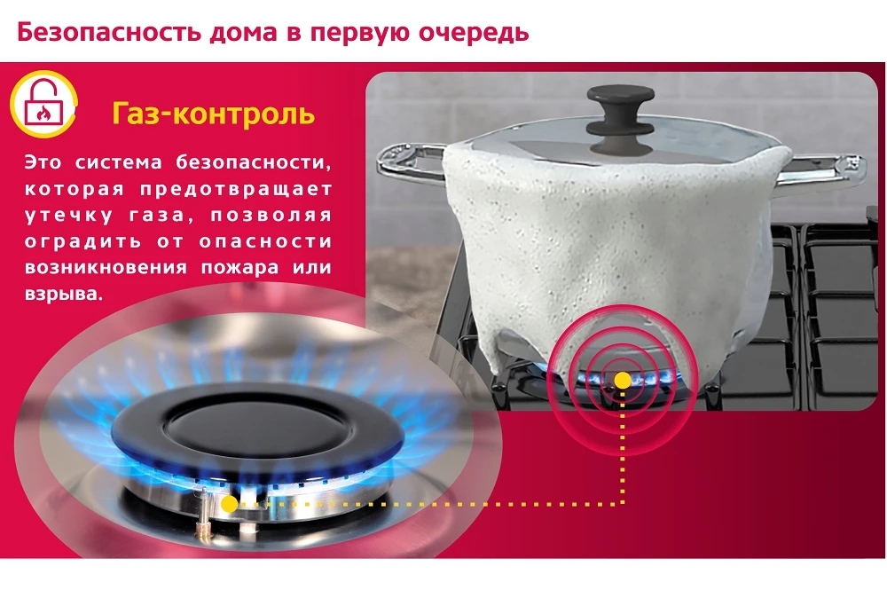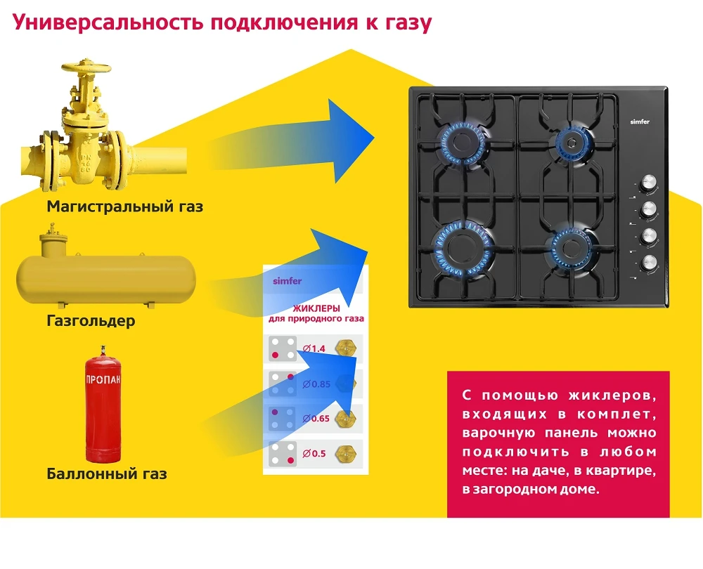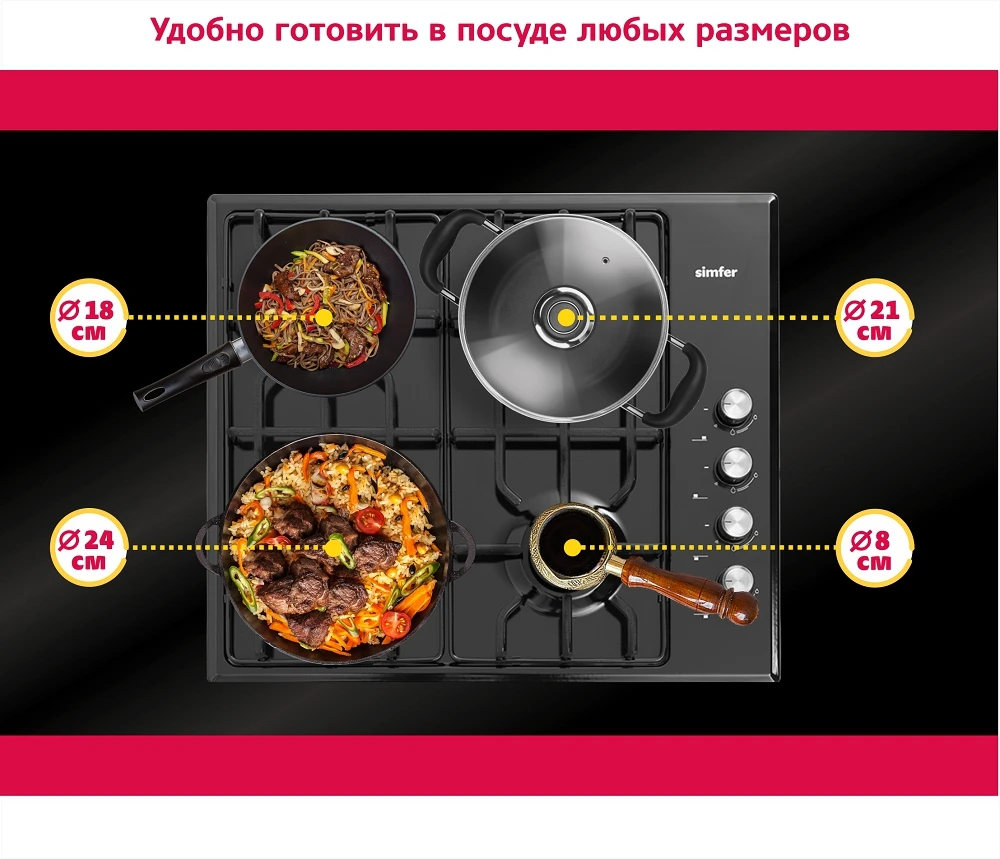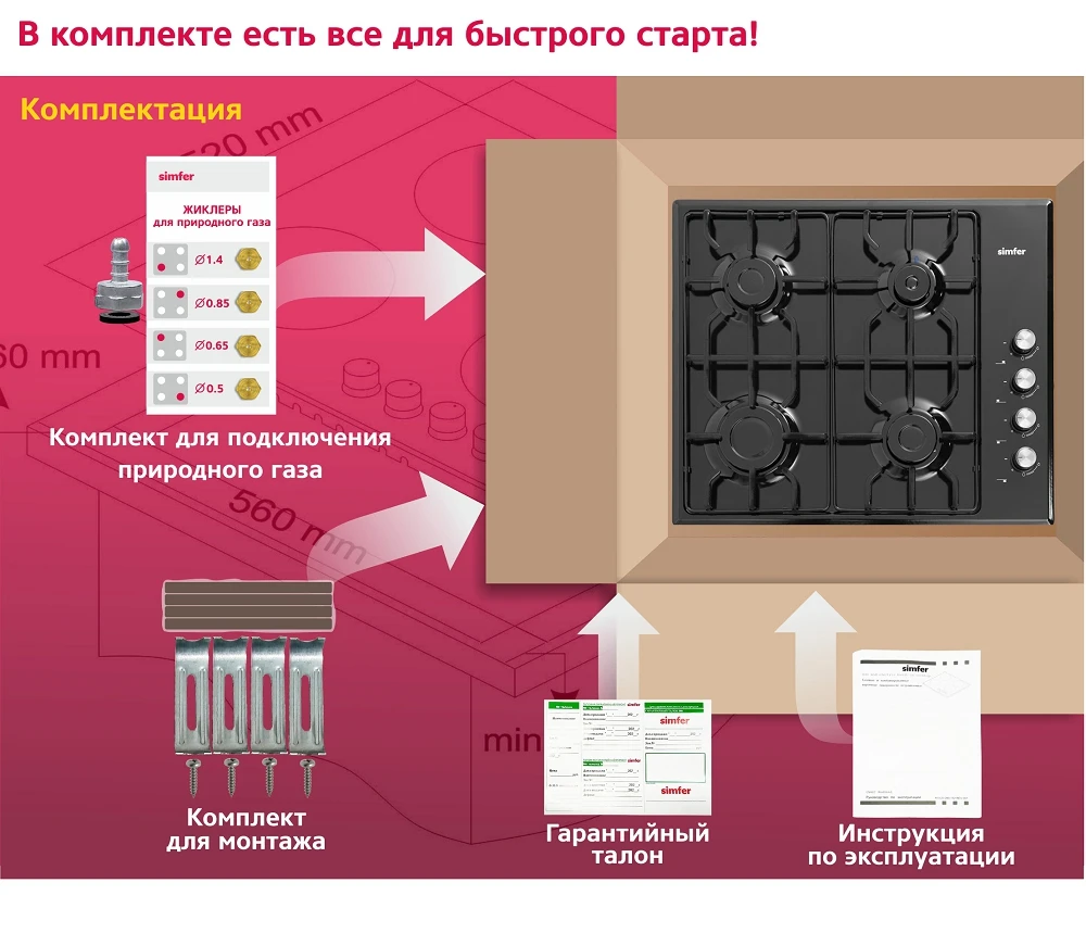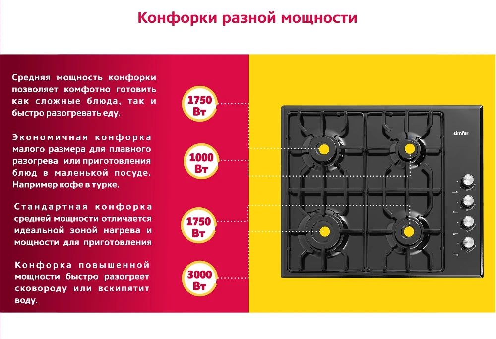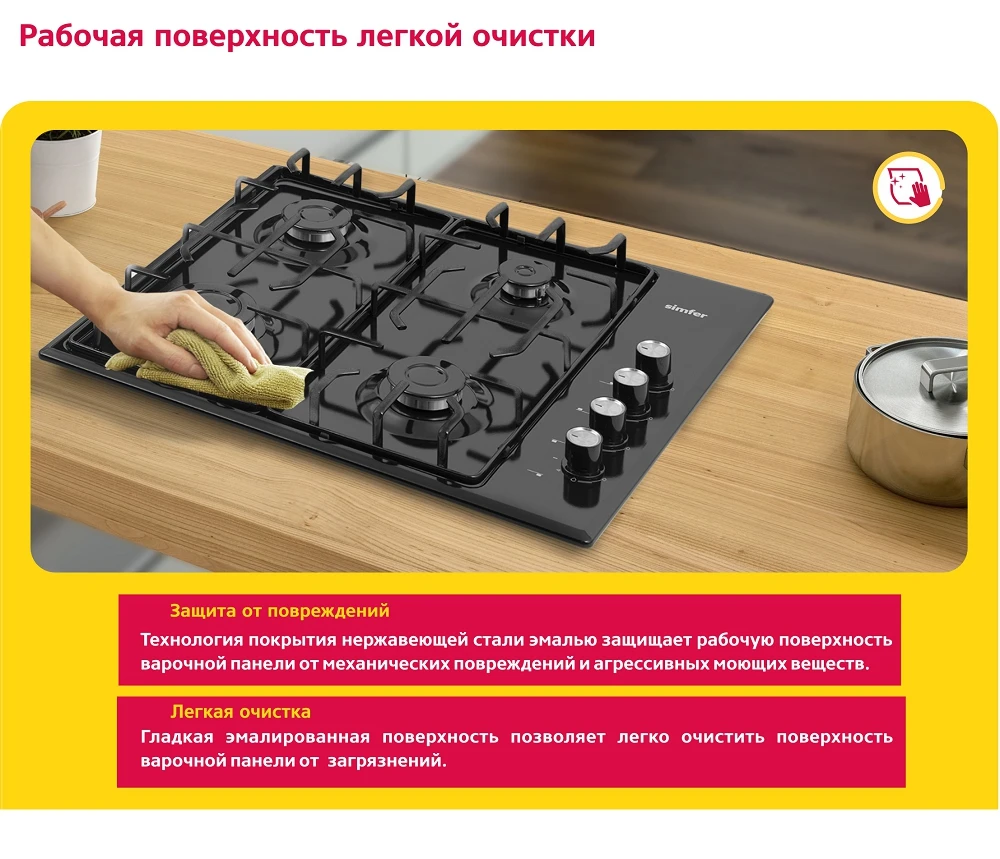 Характеристики Газовая варочная панель Simfer Flat решётки LAMA, газконтроль, автоподжиг