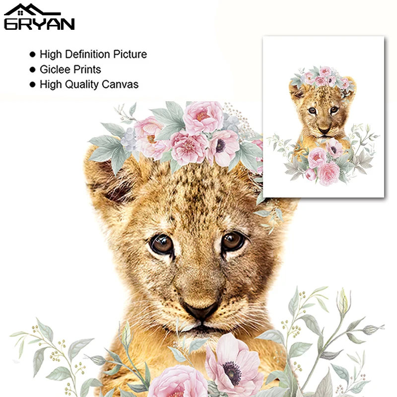 Сафари для домашнего декора анималистический настенный художественный холст плакат Цветочная корона лев тигр рисyнкoм жирaфa или слон для детской комнаты с принтом живопись Скандинавская картина