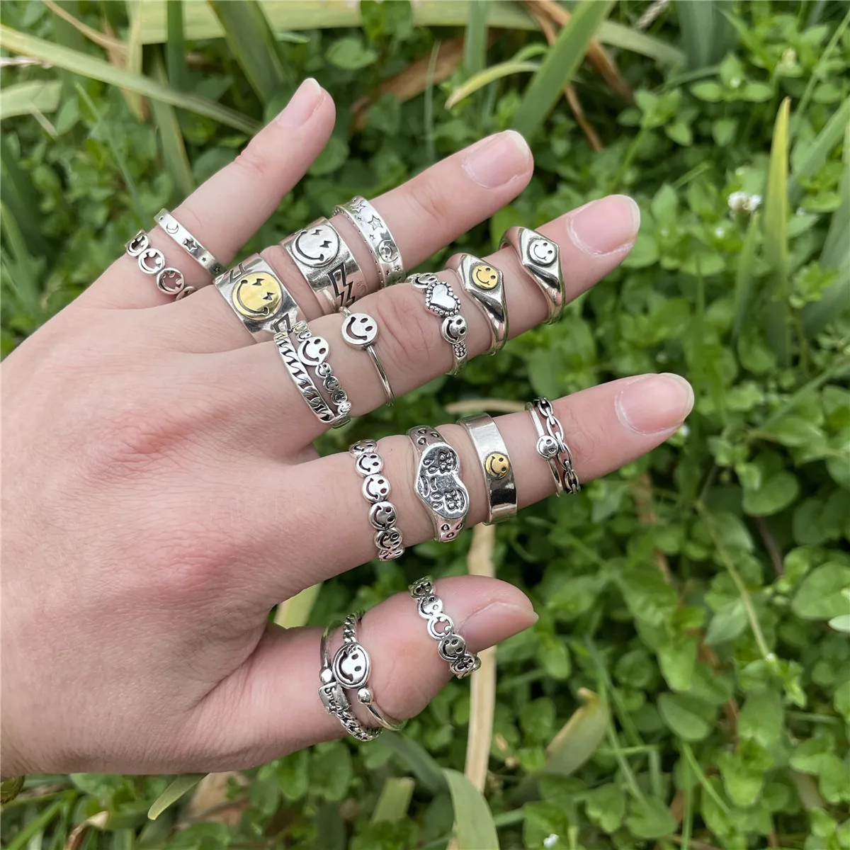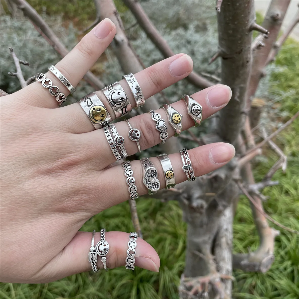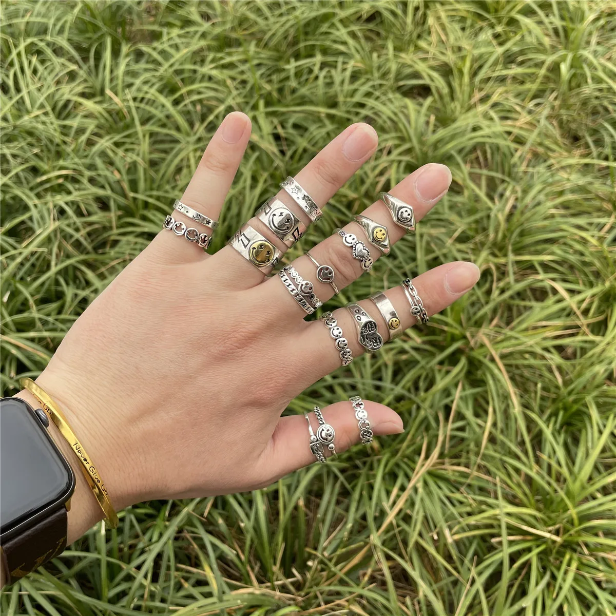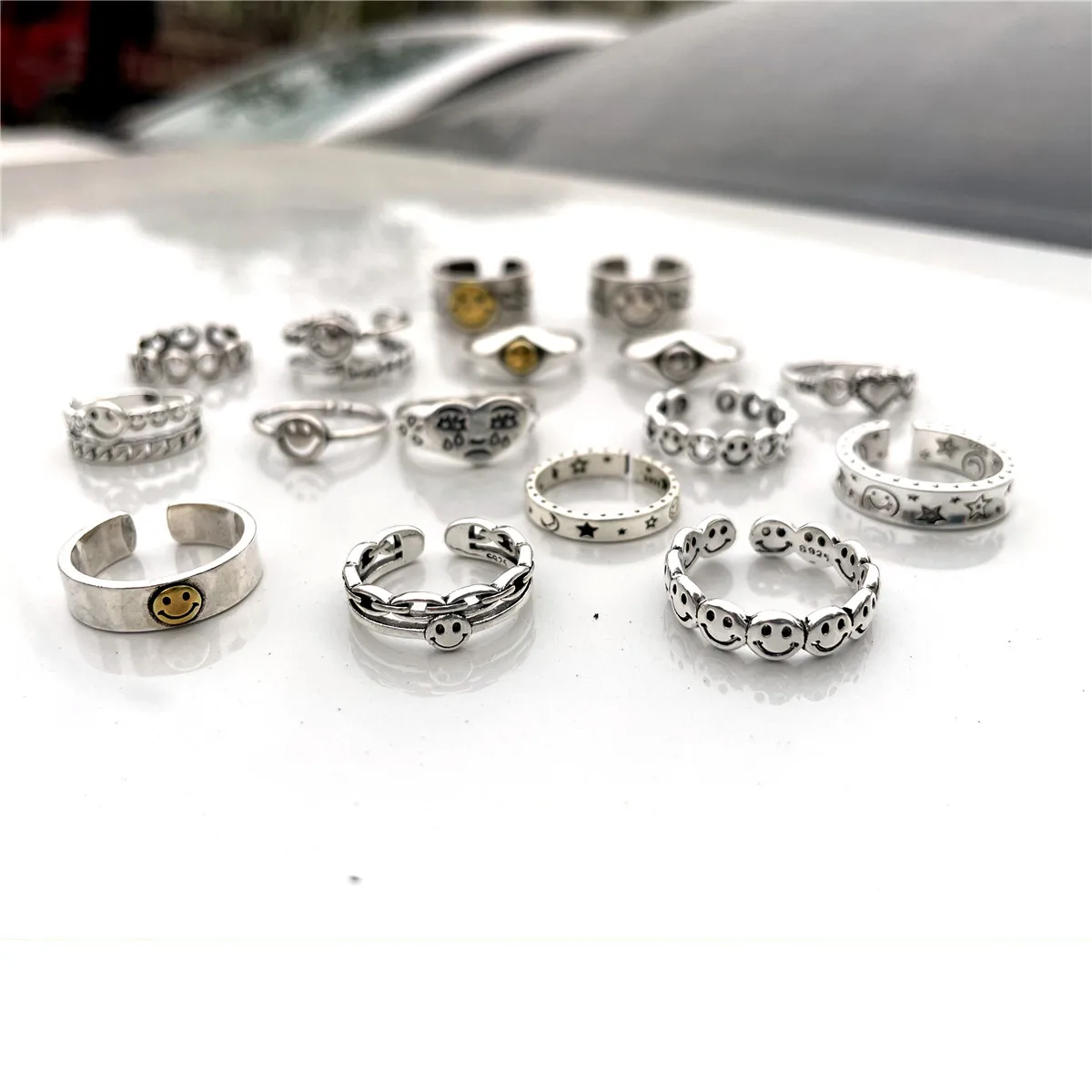 Кольцо женское, 15 видов стилей, ажурное, разные смайлики, регулируемое, цвет: старое серебро