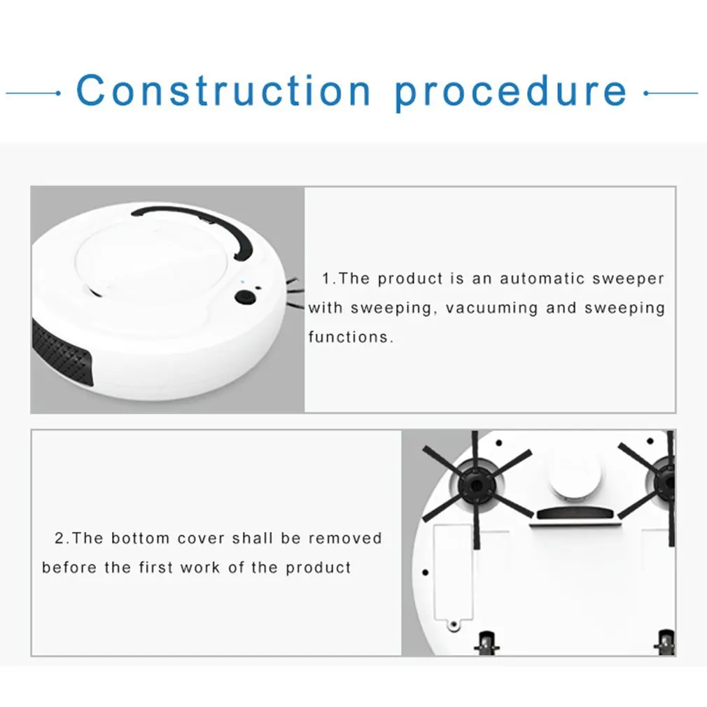 Особенности:1. Несколько режимов очистки. Система обнаружения местности OBS.2,65 мм тонкий дизайн. 65 дБ низкий уровень шума. 65 дБ низкий уровень шума бесшумный дает вам тихую среду.3,500 ПА сильное всасывание: он легко поглощает пыль, волосы, бумагу и уменьшает загрязнение.4,10 мм Скалолазание: он имеет функцию лазания 10 мм, высоту скалолазания 15 градусов.5,1800 ПА супер сильное всасывание.6. Интеллектуальная индукция избегания падения.7. Большая площадь очистки.Описание:Функция: Запуск одной кнопкой, подметание, уборка, пылесос, зарядка через USB, универсальное вождение, автоматическое Предотвращение препятствий, защита от падения, низкий уровень шума, интимное, низкое повторение, высокий охват.Характеристики:Материал: АБС-пластикЦвет: белый, черный, серый (опционально)Батарея: 3,7 V 1200 мА/ч, БатареяВремя работы: 100 минутВремя зарядки: 3 часаПлощадь уборки: 120-150 квадратных метровРабочая Напряжение: 3,7 VНоминальная мощность: 3 ВтПылезащитная коробка: 400 млРабочий шум <40 дБВсасывание: 1800 paРазмер: 260x260x6 0 мм/10.14x10.14x2.34inВес: 600 г/фунтовРежим работы:1. Режим переключения: нажмите на хост-переключатель, и уборочная машина входит в рабочий режим рабочей лампы, чтобы включить светильник. Нажмите главный выключатель снова и выключите уборочную машину.2. Режим зарядки: Подключите головку Micro-USB usb-кабеля к зарядному порту уборочной машины и подключите usb-головку к конвертеру для зарядки.3. Состояние зарядки: светильник индикатора зарядки включен.Указывая, что зарядка заряжается, а выключение означает, что зарядка завершена, а общее время зарядки составляет около 2-3 часов.Очистка пылесборника: (грязь может быть выдута из впускного отверстия, поэтому, пожалуйста, опустите пылесборник после каждого использования.)1. Пылезащитная коробка расположена в нижней части машины, вытяните вилку, чтобы повернуть наружу.2. Откройте пылесборник, очистите грязь внутри, протрите остатки с помощью высушенной влажной ткани.3. Поместите пылесборник обратно в машину.Информация о посылка:Размер посылка: 390x310x9 0 мм/15.21x12.09x3.51inПосылка Вес: 1060g/2.34lbПосылка с общей коробкойПосылка включает в себя:1 умный робот-подметатель1 x зарядный кабель1 x Кисть1 отвертка1 х Салфетка для очистки1 х литиевая батарея