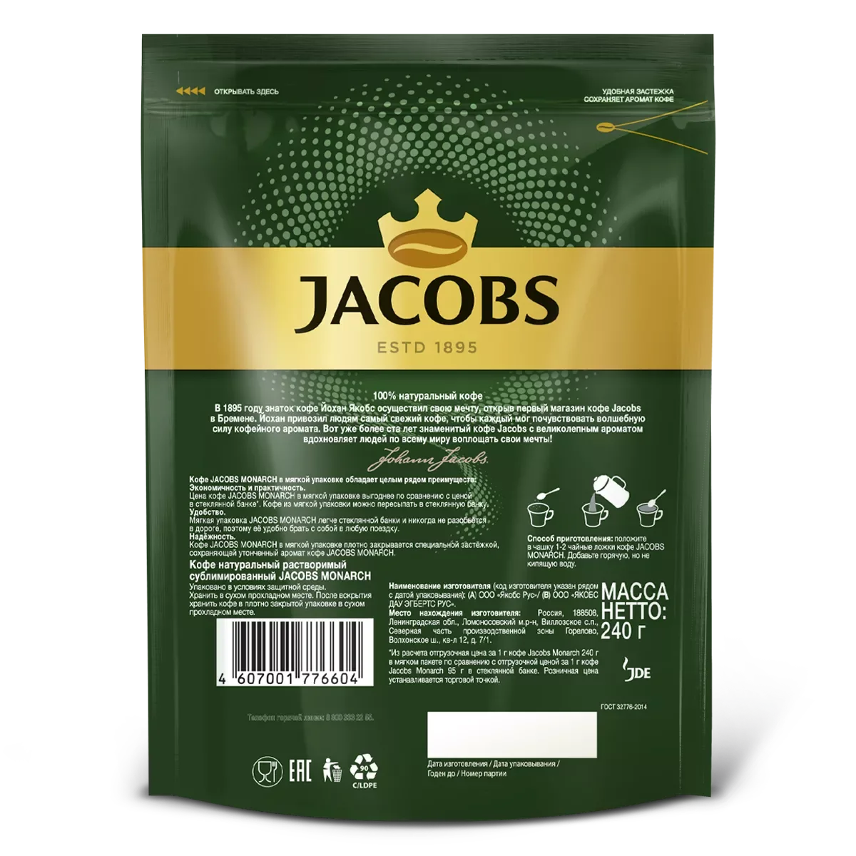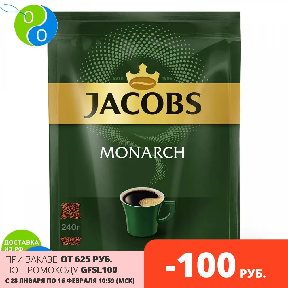 Кофе JACOBS MONARCH натуральный растворимый сублимированный 240г