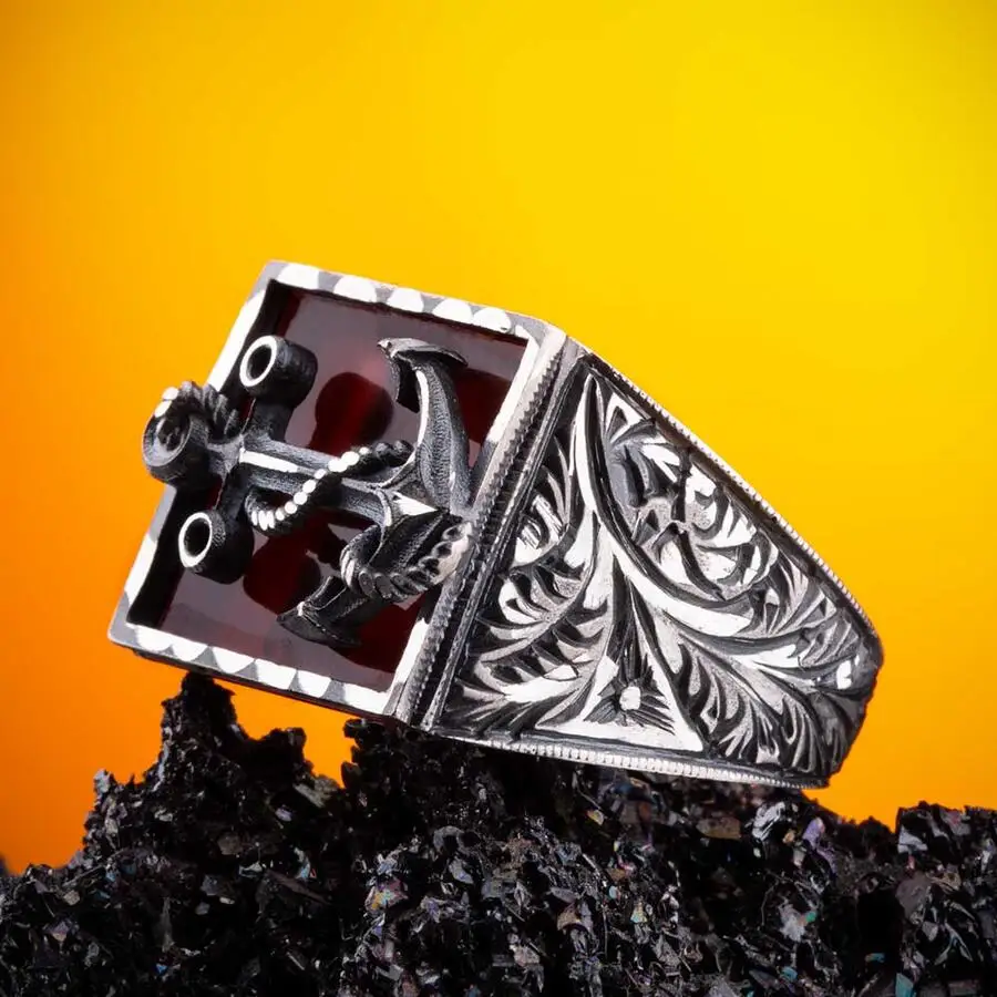 Серебряное мужское кольцо с красным цирконом, мужские украшения руч...