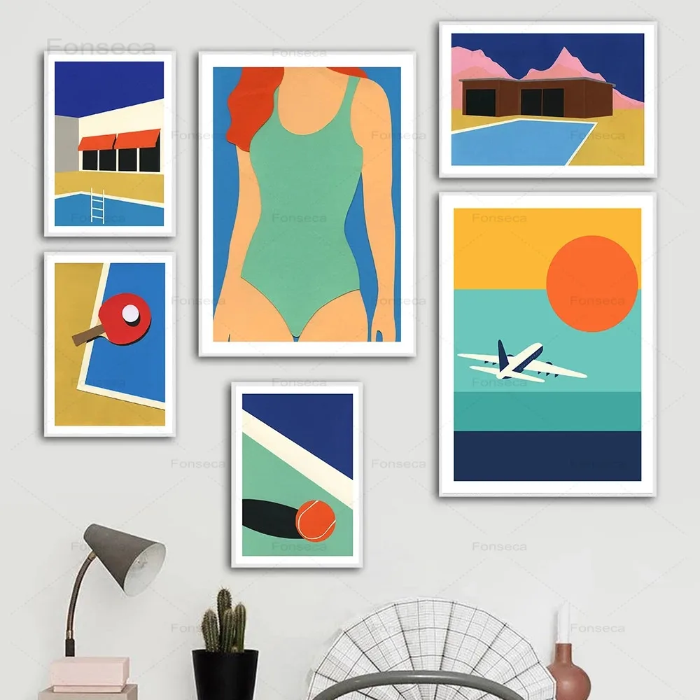 Мультяшные женские плакаты на купальник, самолет, солнце, плавательный бассейн, настольный теннис, холщовая картина, настенное искусство, картина, искусство, искусство, домашний декор