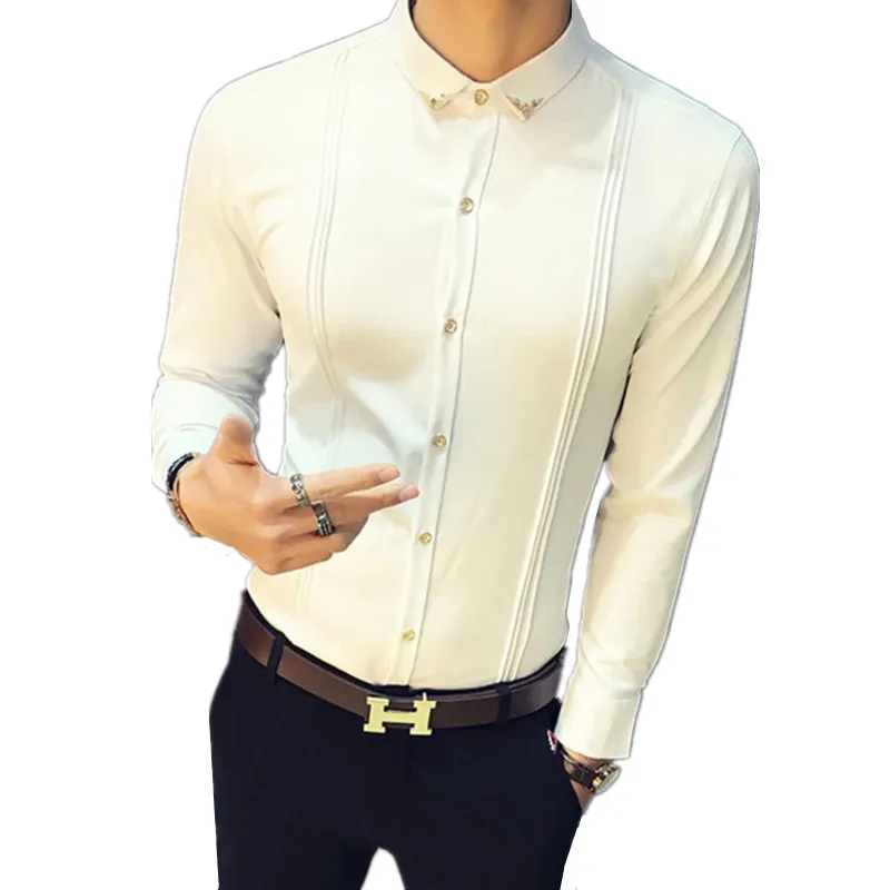 Мужская плиссированная Однотонная рубашка под смокинг, повседневная облегающая блузка с длинным рукавом в английском стиле, одежда для выпускного вечера
