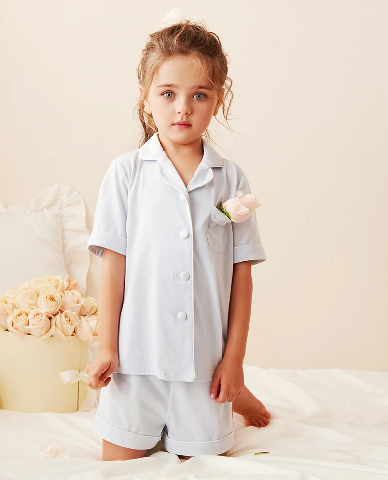 Летние Пижамные комплекты с отложным воротником для девочек, Синие пижамы с коротким рукавом для малышей, Детская домашняя пижама