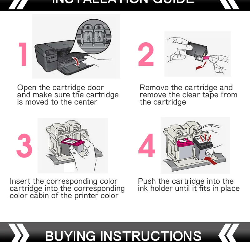 Бренд: Royek Модель: 350XL/351XL Код картриджа: CB336E/CB338EE Цвет: Bk, трехцветный Объем: Bk-18ml, Tri-color-18ml Характеристики: Восстановленный чернильный картридж, используйте пустой оригинальный чернильный картридж для пополнения чернил. Увеличенная губка наполнена большим количеством чернил. Размер XL. Выход страницы: Bk 600 страниц, трехцветные 450 страниц (формат А4, 5% покрытия) Для одного и того же принтера HP в разных странах есть разные модели чернильных картриджей. Пожалуйста, просто купите Чернильный картридж совпадает с вашим оригинальным номером. Картридж 350XL в основном используется в Западной Европе. Не подходит для принтера в России, США.