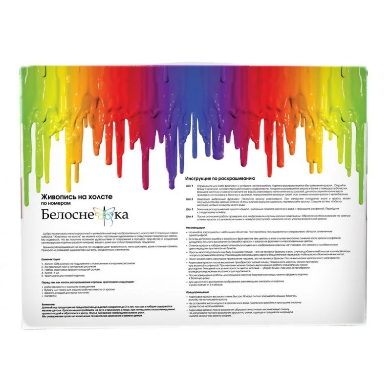 Основа картины – хлопковый холст, натянутый на деревянный подрамник. На холст нанесена схема, разделенная на области для закрашивания. Цифра внутри каждой области указывает на номер краски, которой необходимо закрасить данный участок. В комплект входят акриловые краски на водной основе, экологически безопасные, без запаха, быстросохнущие. Картина раскрашивается без смешивания красок. Набор комплектуется специальными кистями разного размера с искусственным ворсом для акриловых красок.