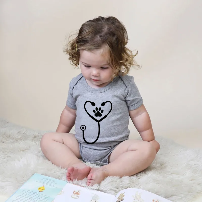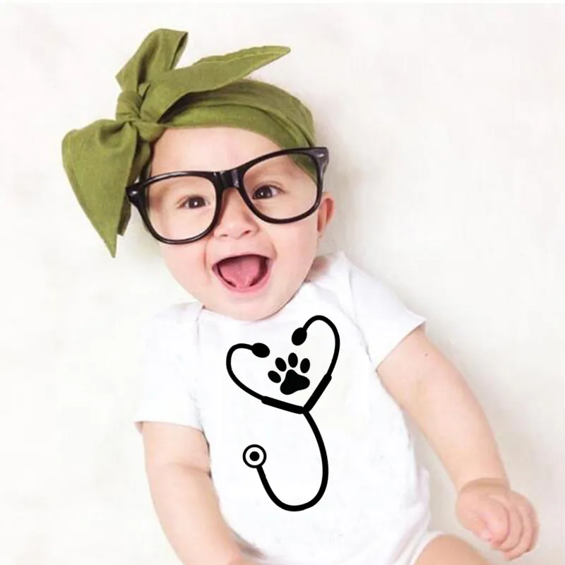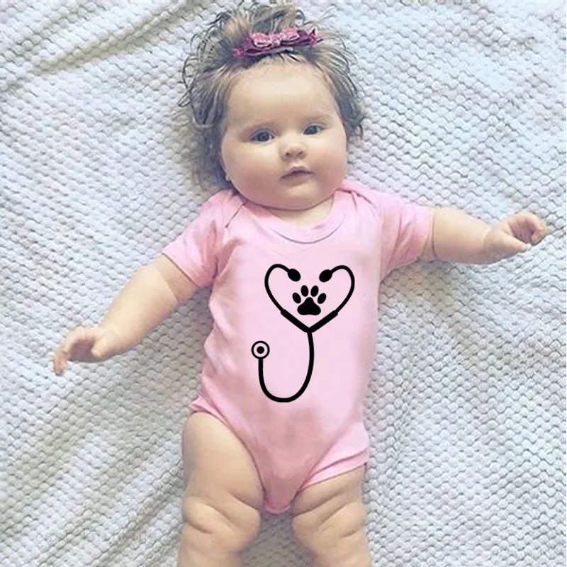 2021 новая одежда для малышей с милым рисунком собачьей лапы и стетоскоп с принтом хлопковые боди для новорожденных; Летняя одежда для мальчиков и девочек; Комбинезон с короткими рукавами