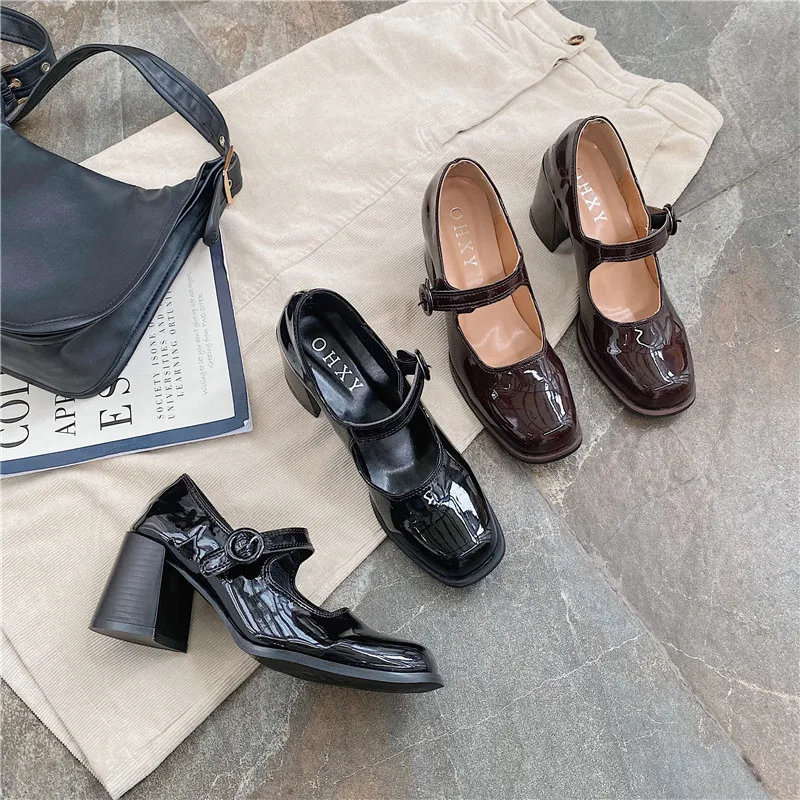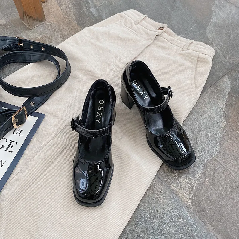 Женские туфли-лодочки на толстом каблуке; Классические туфли мэри джейн из лакированной кожи с квадратным носком и ремешком с пряжкой