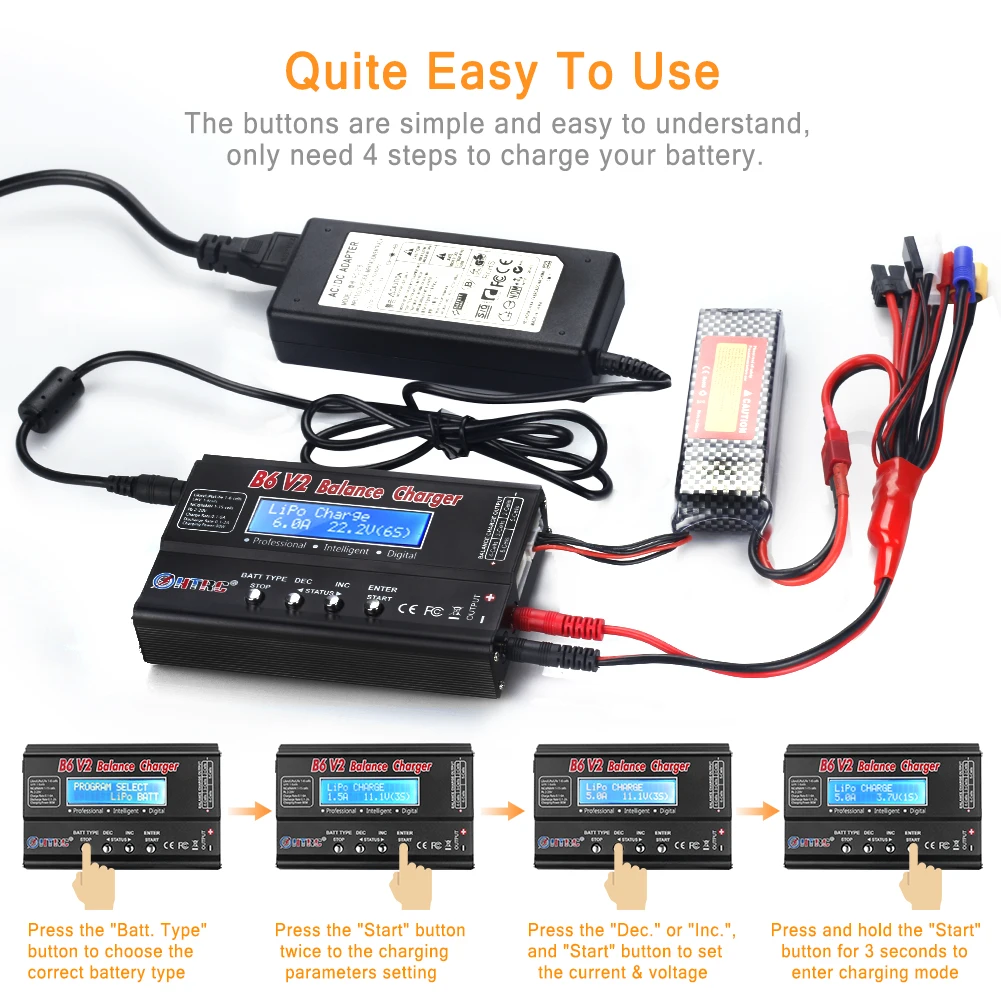 * Режим работы:-Lipo/Lilo/LiFe/LiHv: баланс заряда, заряда, быстрое зарядное устройство, хранение, разрядка.-NiMH/NiCd: зарядка, разрядка, цикл.-PB: зарядка, разрядка. Характеристики зарядного устройства B6 V2:* Диапазон рабочего напряжения: адаптер DC11.0-18.0 Вольт/переменного тока в постоянный ток (DC11.0-18.0V/ 6A)* Максимальная мощность зарядки 80 Вт* Максимальная разрядная мощность 10 Вт* Диапазон заряда: 0,1-6.0A* Диапазон тока разряда: 0,1-2.0A* Слив тока для балансировки: 400 мАч/ячейка* LiIon/LiPo/LiFe/ LiHV клетки: 1-6 клеток* NiCd/NiMH клетки: 1-15 ячеек* Pb Напряжение батареи: 2 ~ 20 в* Умный аккумулятор: I II III.* Размеры: 135x86x27мм
