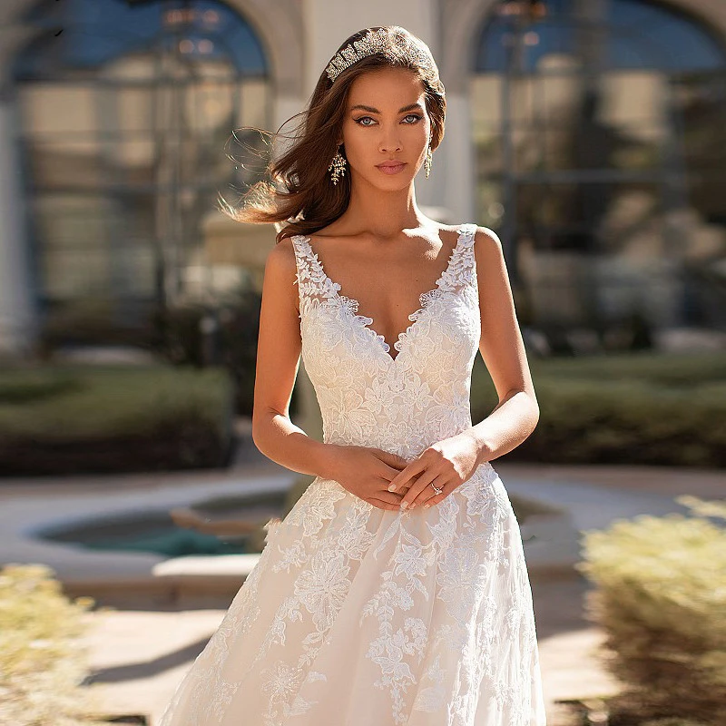 Платье Свадебное ТРАПЕЦИЕВИДНОЕ с V-образным вырезом, кружевной апп...