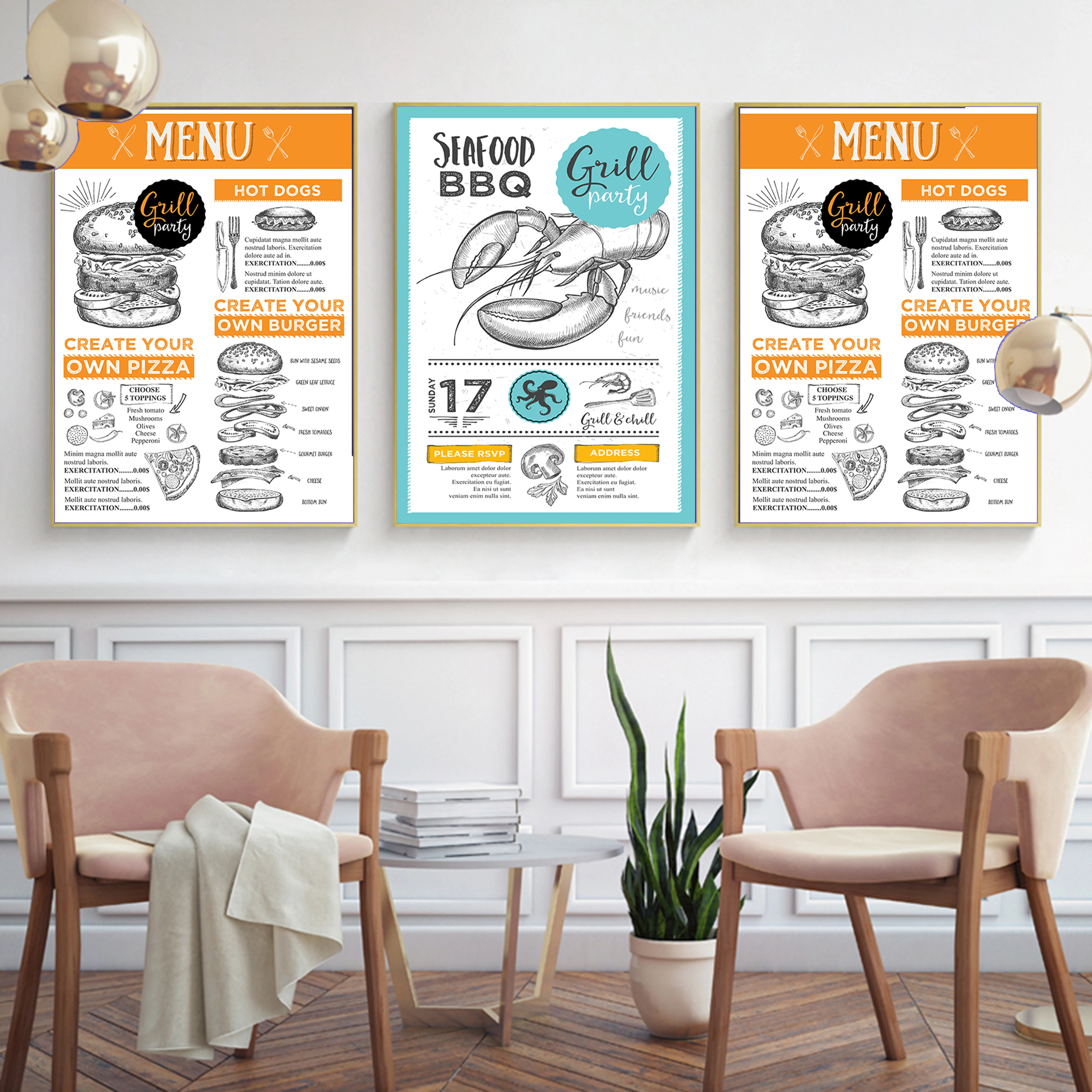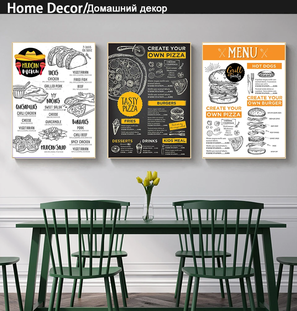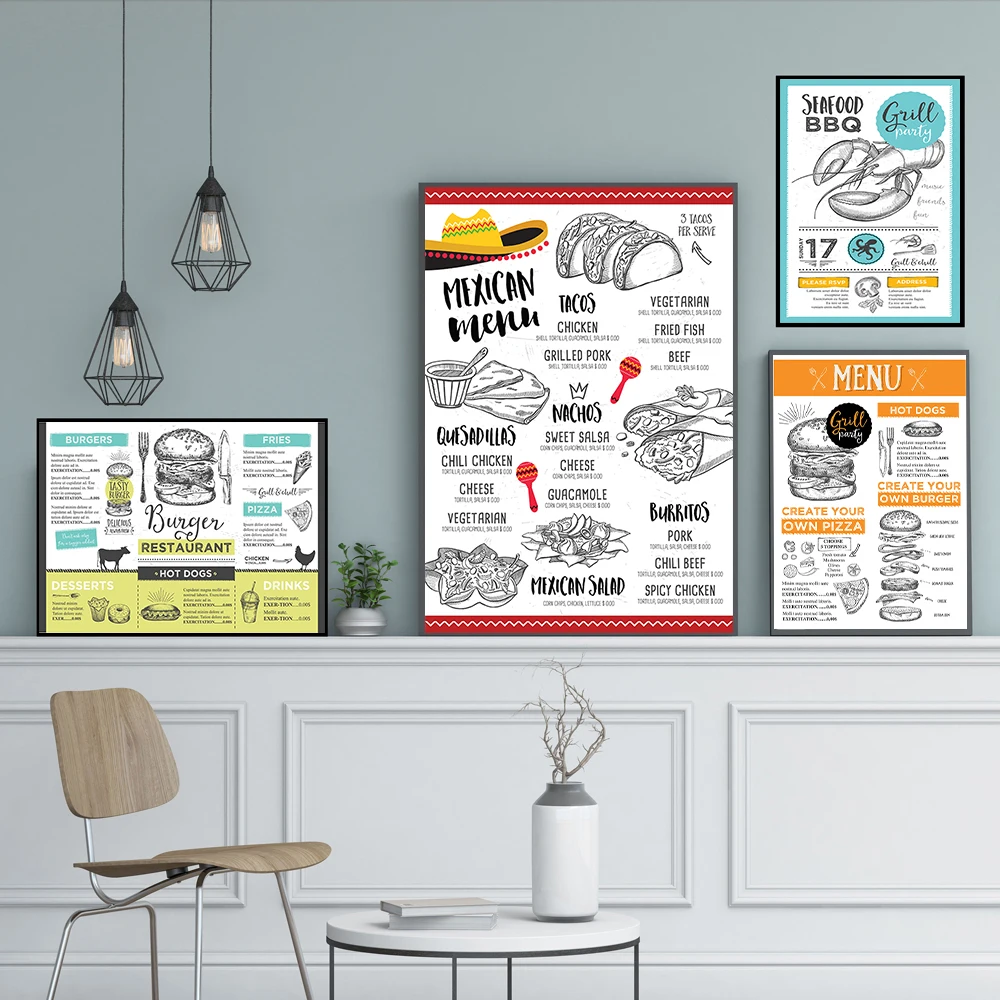 Гамбургер, пицца Еда Nordic Плакаты принты ресторана кафе Кухня Пособия по кулинарии Wall Art Картина на холсте, украшение Украшения для обеденной