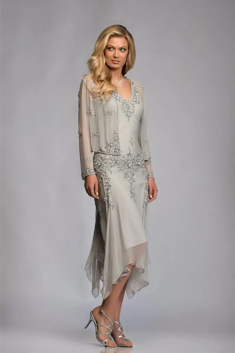 2021 г., с жакетом платья для матери невесты ТРАПЕЦИЕВИДНОЕ шифоновое размера плюс с бисером Короткое свадебное платье для матери жениха