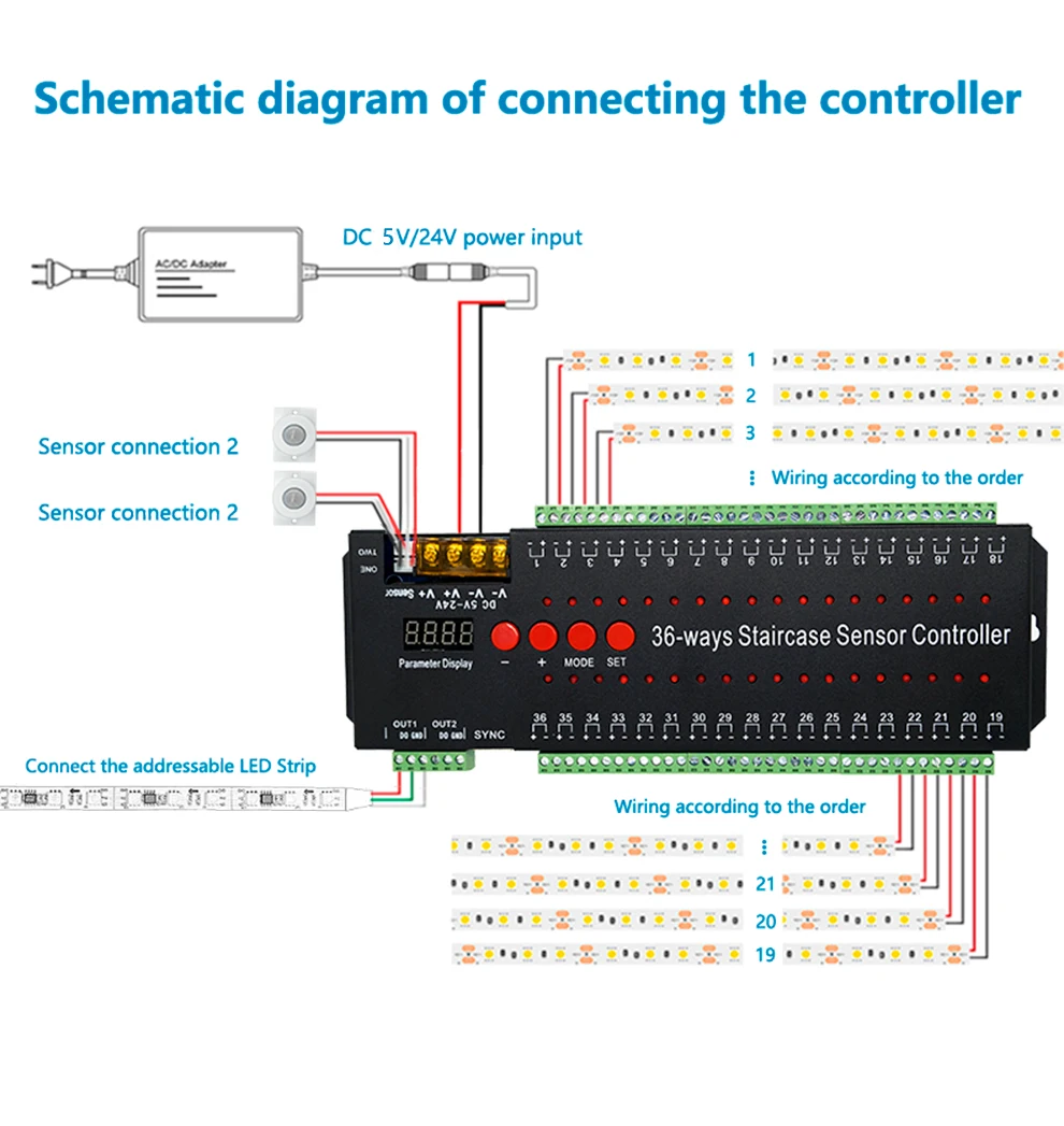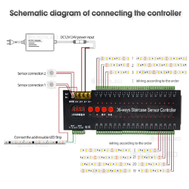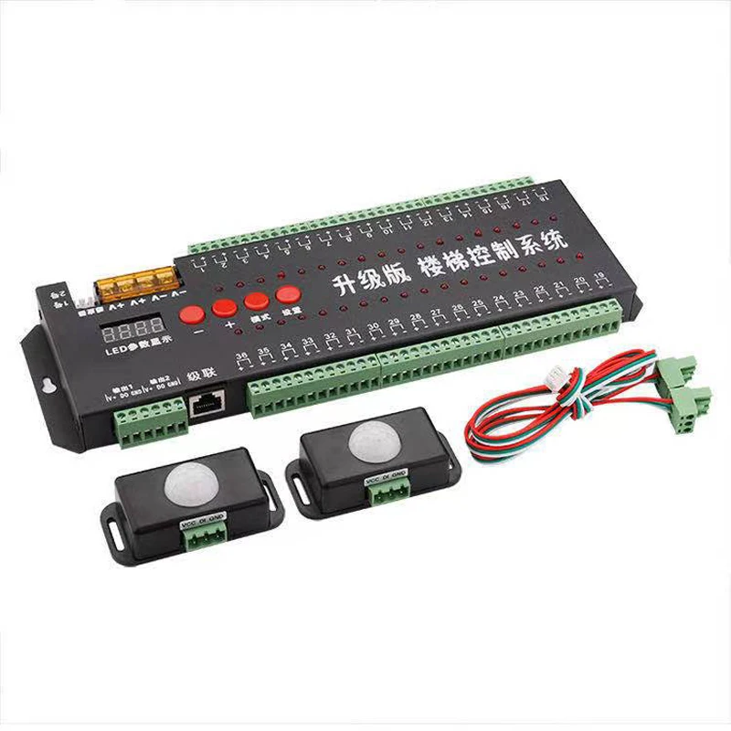 Предположение: контроллер sup port s до 36 каналов, но фактические лестницы имеют только 29 шагов, 14 шагов на первом этаже, 15 шагов на втором этаже, затем проводка заключается в том, что первый шаг на первом этаже соединяется от порта 01 до порта 14, Последний шаг на втором этаже соединяет обратно от порта 36 до порта 17.
