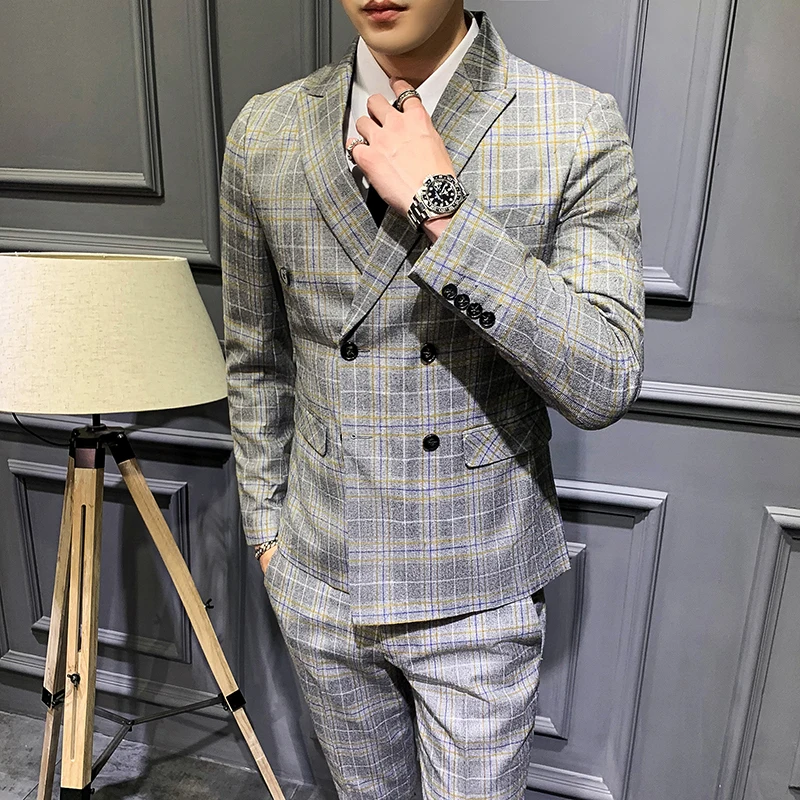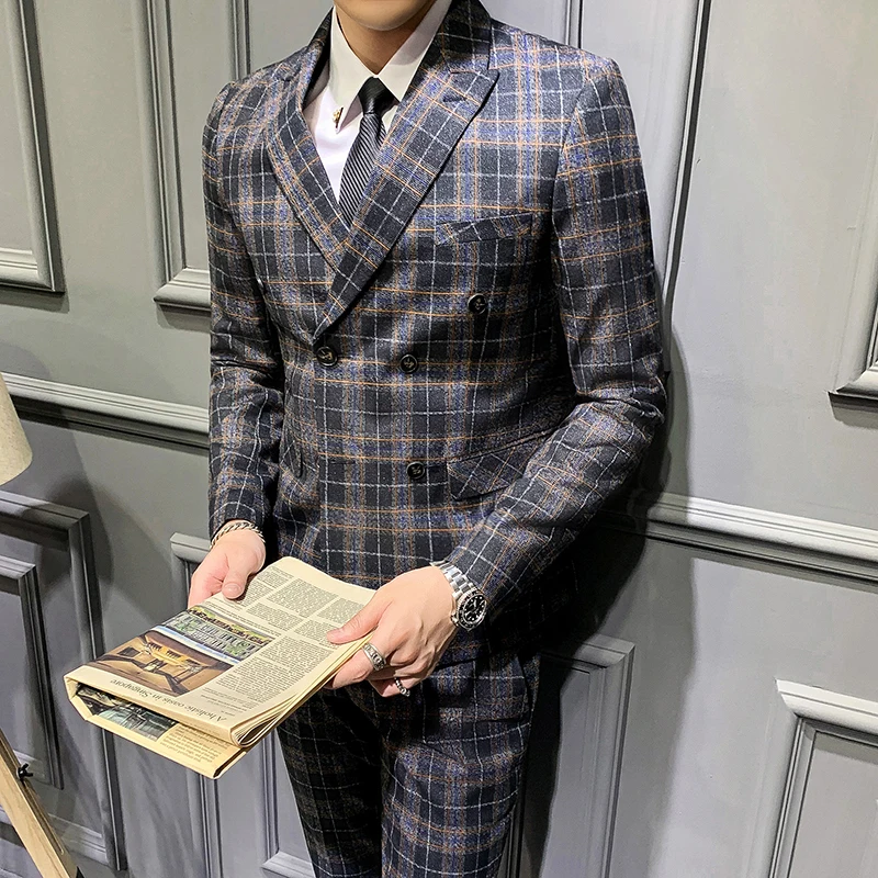 Пиджак мужской модный Банкетный облегающий комплект из 2 предметовмужской деловой клетчатый пиджак и брюки двубортный пиджак