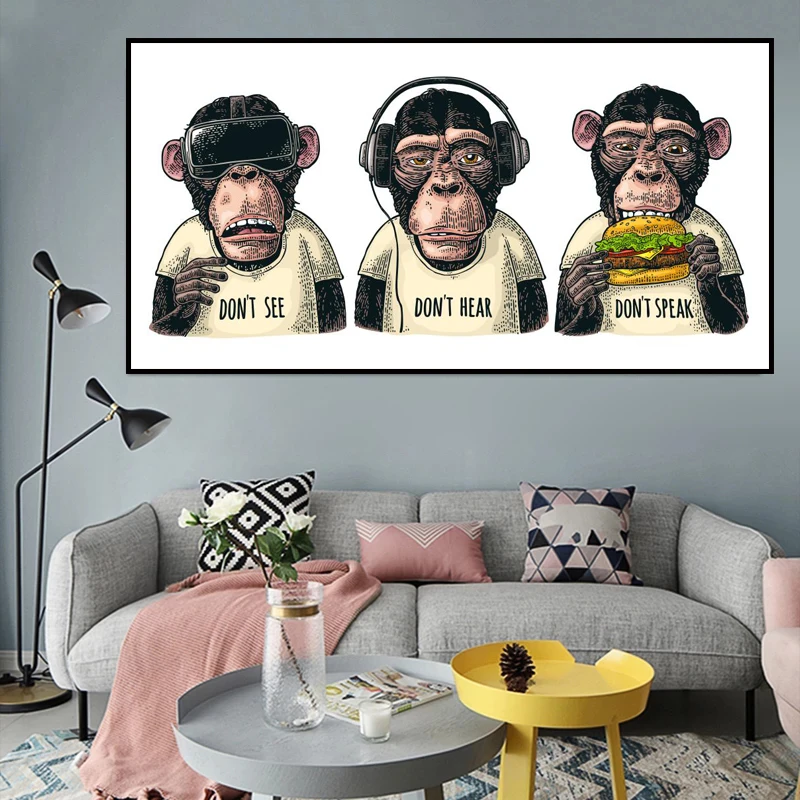 Картина на холсте с изображением трех забавных обезьян, гориллы с Гамбургом, плакаты с изображениями животных, настенные картины для гостиной, дома, Куадрос