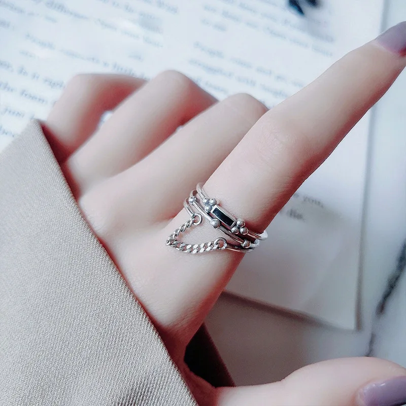 Женское кольцо с черным Цирконом, винтажное Открытое кольцо серебряного цвета с цепочкой, украшение для девушек и женщин, Подарочная бижутерия