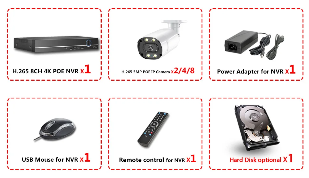 1 сетевой видеорегистратор 8CH 4K POE NVR;2/4/8 X HD двухканальные аудио POE IP 5.0MP Крытый Открытый ИК Полный Цвет День ночного видения камеры;1 X Блок питания для NVR;1 х USB мышь для NVR;1 компакт-диск программного обеспечения для NVR;1 пульт дистанционного управления для NVR;Жесткий диск опционально!