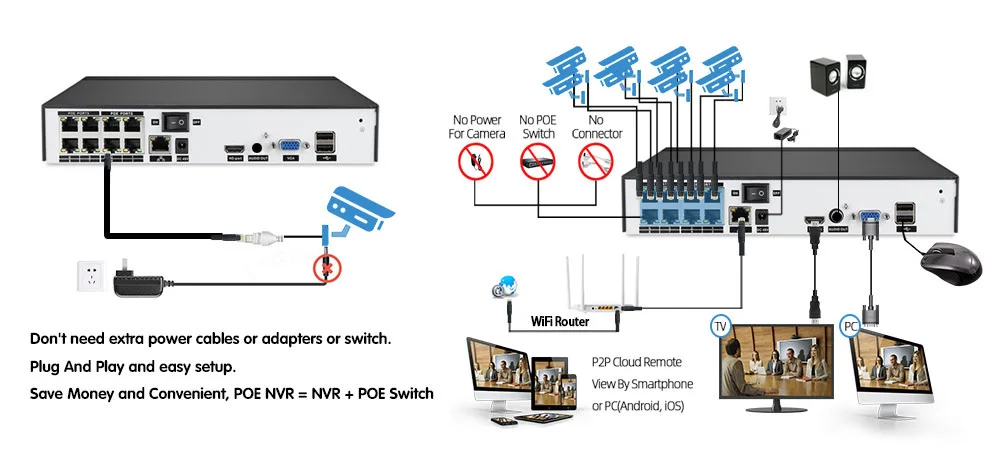 Нет дополнительных кабелей питания или адаптеров, просто подключив ip-камеру к NVR с помощью одного кабеля, вы можете легко завершить установку без знания о компьютере или сети и начать наслаждаться супер простым мониторингом среди вашего смартфона, планшета или ПК.Экономьте деньги и удобный POE NVR = NVR + POE коммутатор, подключи и работай и простая настройка!