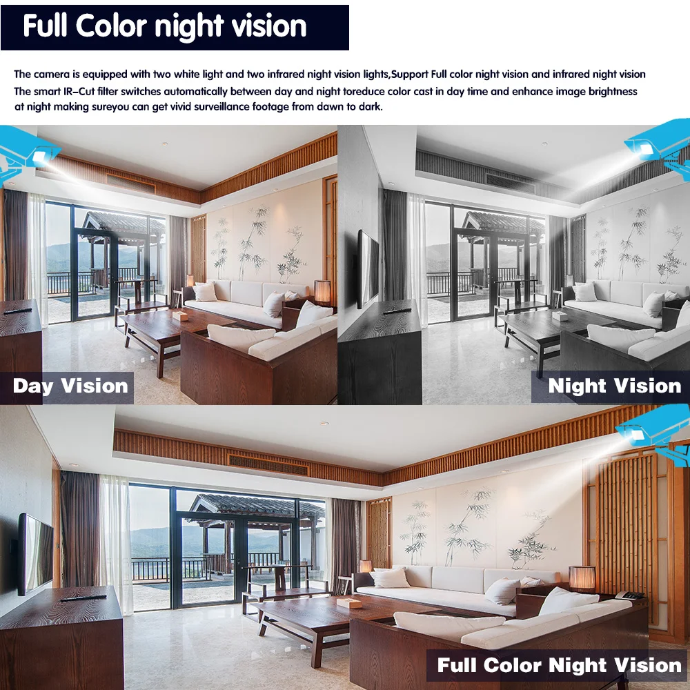 Камера оснащена двумя белый светильник и два ИК ночное видение светильник s, Поддержка Полный Цвет ночного видения и ИК ночное видение,Умный фильтр, отсекающий ИК-спектр автоматически переключается между днем и ночью, цвет toreduce в дневное время и повышает яркость изображения в ночное время. Вы можете получить яркие кадры наблюдения от рассвета до темноты.