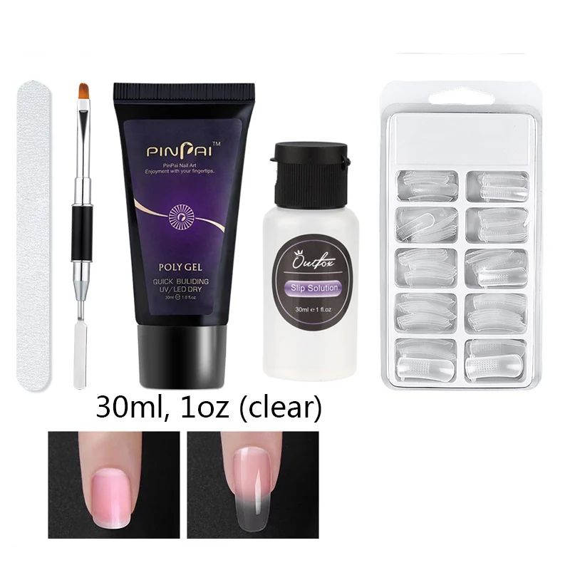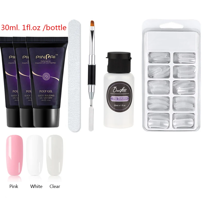 1*100 шт. двойная форма 1 * Серый 100/180 пилка для ногтей 1 * Двойная Ручка для ногтей 1*30 мл, 1 унция раствор для скольжения, гель легко окрашивается 1*15 мл, прозрачный цветной поли гель для ногтей 1*15 мл, белый цвет поли гель для ногтей 1*15 мл, розовый цвет поли гель для ногтей