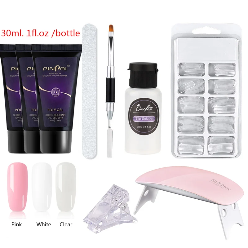 1*100 шт. двойная форма 1 * Серый 100/180 пилка для ногтей 1 * Двойная ручка для ногтей 1*30 мл/1 унций раствор для скольжения, сделать гель легко для краски 1*30 мл/1 унций прозрачный цвет поли гель для ногтей 1*30 мл/1 унций Белый Цвет Поли гель для ногтей 1*30 мл/1 унций розовый цвет поли лак для ногтей гель