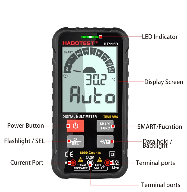 Цифровой мультиметр HABOTEST HT112B, умный автоматический диапазон, 600 В, мини-вольтметр, тестер батареи, True RMS, детектор емкости, бесконтактного индикатора напряжения
