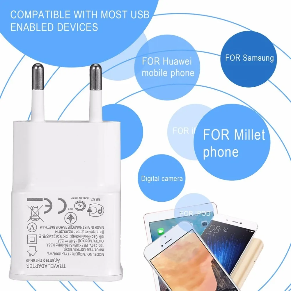 1.100% новый и высокое качество.2. Идеально подходит для путешествий, дома или офиса.3. Обеспечивает быструю и эффективную зарядку.4. Высокая эффективность и низкое энергопотребление.5. Защитная цепь для предотвращения перезарядки.6. Используйте имеющийся usb-кабель для зарядки/синхронизации.7. Размер кармана, компактный, легкий, прочный, легко брать в любом месте.8. Просто подключите его к розетке и зарядите через соответствующий USB кабель.9. Чтобы использовать его с любыми usb-устройствами, просто подключите usb-кабель (не входит в комплект) к вашему устройству, а затем к зарядному модулю, прост в использовании.10. Совместимость с большинством usb-устройств, включая Samsung, Apple для iphone, iPod, Microsoft Zune, мобильный телефон, КПК, цифровую камеру/видеокамеру и многое другое.Характеристики:Цвет: белыйВес нетто: 23 гТип вилки: штепсельная вилка европейского стандартаВыход: DC 5V 2A (макс.)Вход: AC100-240V, 50-60 Гц, 0.35AРазмер: Approx.6.9 (Д) x 3,6 (Ш) x 2,1 (В) смПосылка включает в себя:Настенное зарядное устройство USB-1 шт.(USB кабель не входит в комплект)
