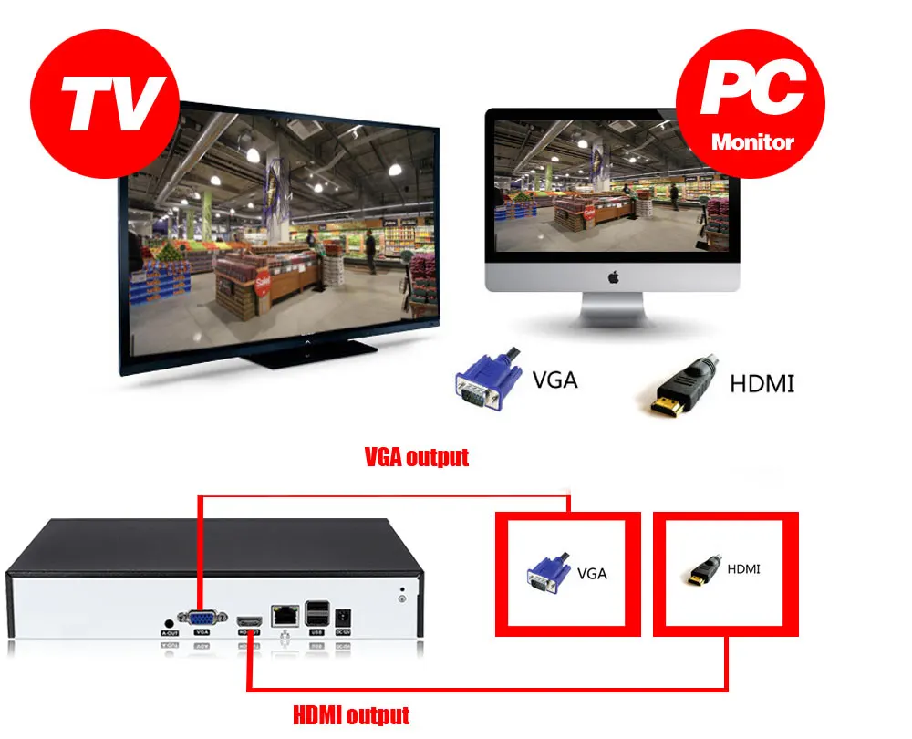 Для дополнительного удобства NVR также поставляется с разъемами VGA и HDMI для стандартных вариантов просмотра разрешения.