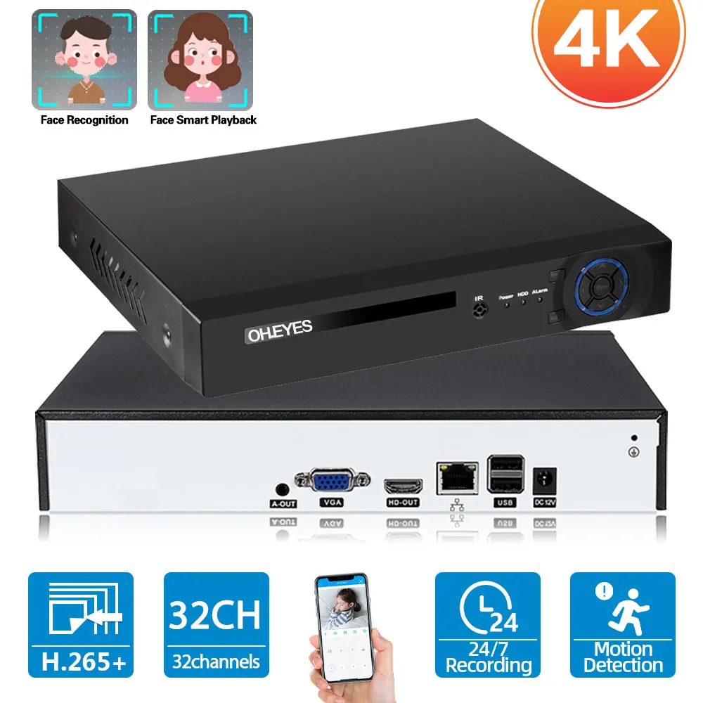 Уход за кожей лица обнаружения CCTV видеонаблюдение Регистраторы 4K 32CH NVR для H.265 IP Камера 8MP Смарт Сетевой Видео Регистраторы 16ch NVR ONVIF