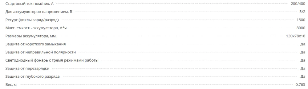 Новейшая разработка: литий-полимерный аккумулятор, благодаря которомубатареи небольшого веса и размера выдают высокий пусковой ток и имеютпродолжительный срок службы.• Запуск бензиновых двигателей объемом до 3л.• Зарядка мобильных телефонов и других устройств от USB• Защита: от перезарядки, глубокого разряда, короткого замыкания, неправильной полярностиНезаменимый помощник, на даче, в командировке, в путешествии, на рыбалке.