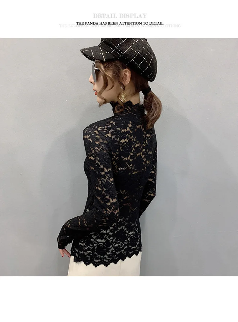 Осенняя Женская тонкая черная кружевная футболка, привлекательная Водолазка с длинным рукавом, тонкая кружевная вязаная крючком Футболка в стиле пэчворк, топы WDC6074