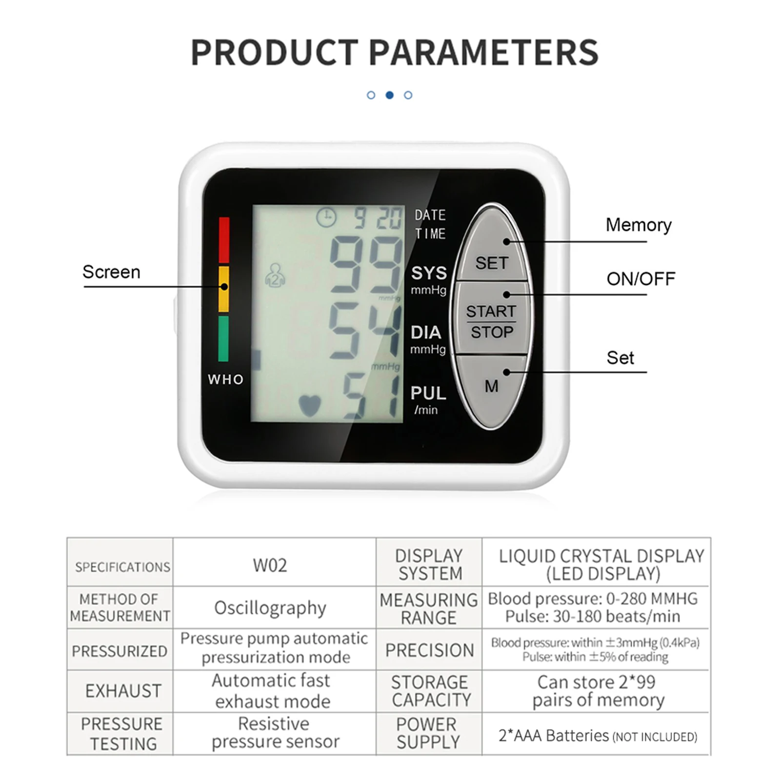 Этот наручный Монитор артериального давления с трехцветным индикатором светильник, быстро проверить состояние здоровья. ЖК-дисплей подходит для пожилых людей. Компактный размер, позволяет измерять в любом месте и в любое время.Особенности:Метод измерения осциллографа для измерения артериального давления, точный и быстрый.С трехцветным индикатором состояния, вы можете определить, находится ли в нормальном диапазоне с первого взгляда.Большой ЖК-дисплей, легко читаемый, что удобно для пожилых людей.Один клик измерения, легко чистить и использовать.Две группы пользователей, каждый пользователь может записывать до 99 измерений.Интеллектуальное давление, не дискретизируется при использовании.Компактный размер удобно брать, позволяет измерять в любом месте и в любое время.Манжета большого размера почти подходит всем людям независимо от того, тонкий или сильный.Характеристики:Модель: W02Материал: АБС-пластик + ПоликарбонатЦвет: белый и черныйЕдиница измерения: кПа/мм рт. Ст.Метод измерения: осциллографПользователь: 2 пользователяХранение данных: 99 групп на человекаДиапазон измерения:Кровяное давление: 0-280 мм рт. Ст. (0-37,3 кПа)Частота сердечных сокращений: 30-180 раз/минутТочность:Кровяное давление: ± 0,4кпа (± 3 мм рт. Ст.)Частота сердечных сокращений: ± 5%Источник питания: 2 батареи AAA (не входят в комплект)Посылка Размеры: 120*90*90 мм/4,72*3,54 * 3.54inПосылка Вес: 247g/8,71 ozУпаковочный лист:1 * Монитор артериального давления1 * коробка для хранения1 * Руководство пользователя