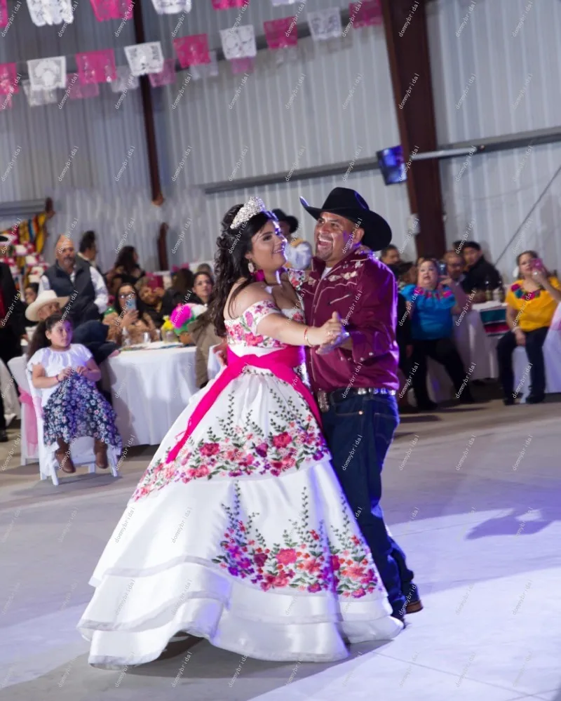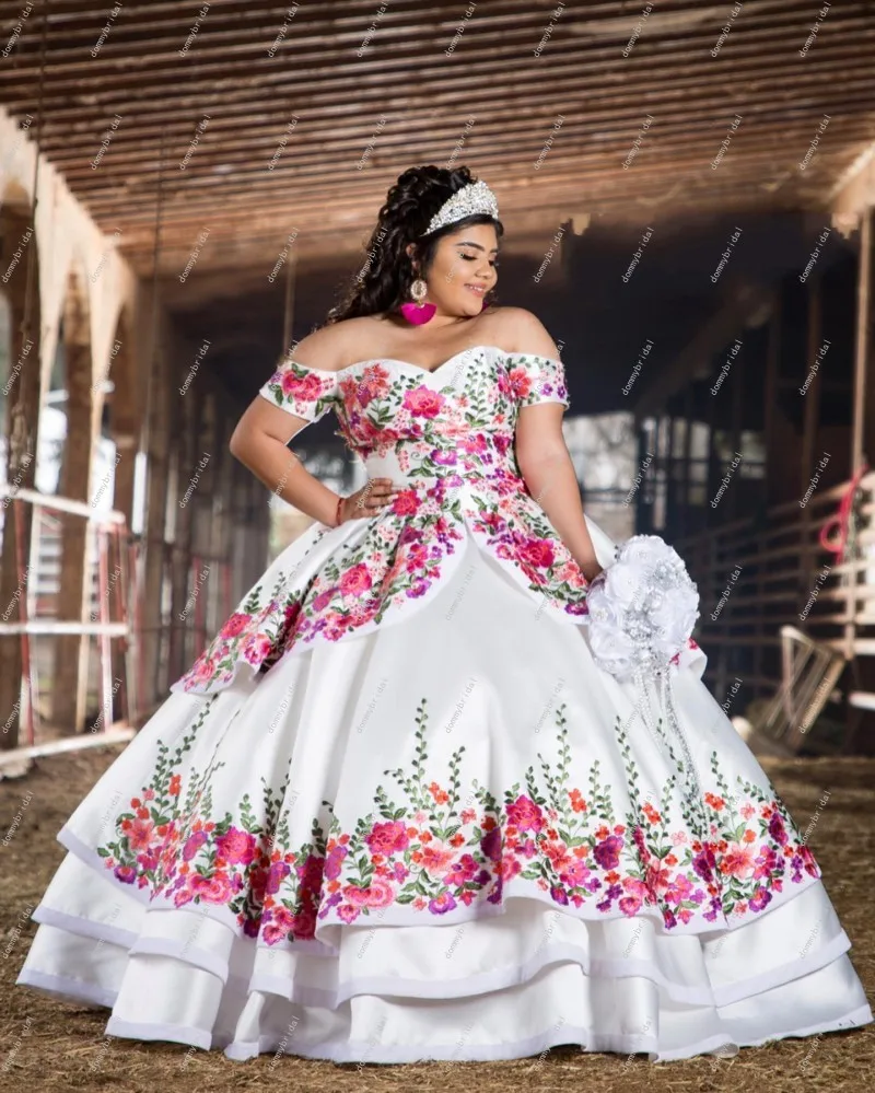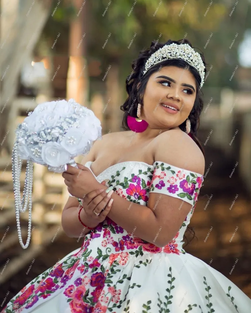 100% Новинка, романтичные цветы 3D, белый вырез с открытыми плечами, сатиновая ткань, короткие рукава, шнуровка сзади, полная длина, дизайн принцессы, vestido De 15 Anos Quinceanera вечерние выпускные торжественные Свадебные платья для гостей для женщин Милые 15 16 Бальные платья