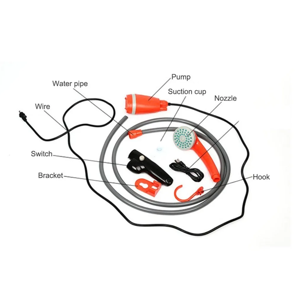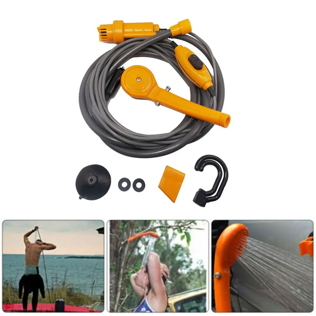 Портативный автомобильный душевой набор-это предмет для использования в помещении и на открытом воздухе.Отлично подходит для душа, чистки автомобиля, собаки и т. д.Работает с контейнером для воды (не входит в комплект).Напряжение: 12 В (гнездо автомобильного прикуривателя).
