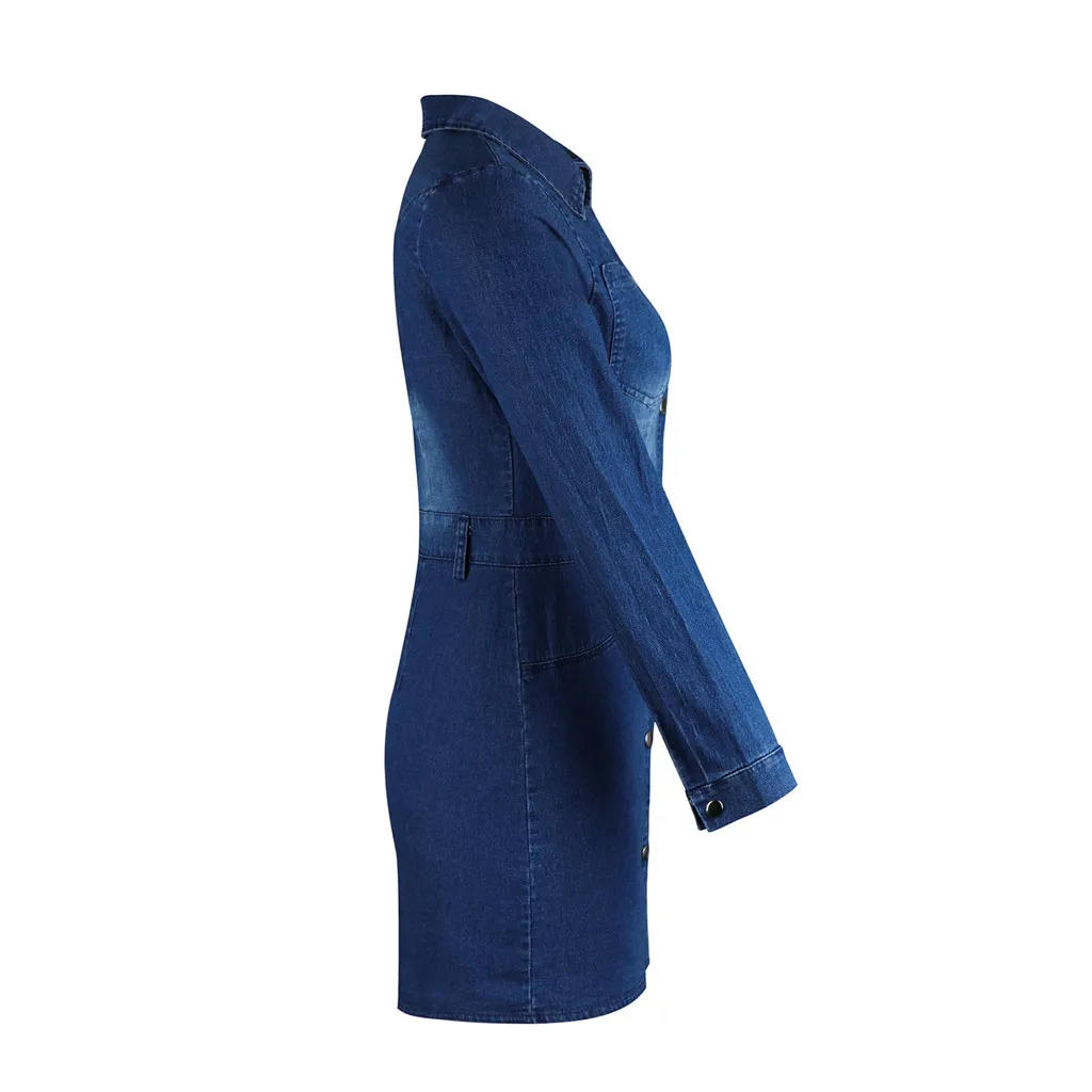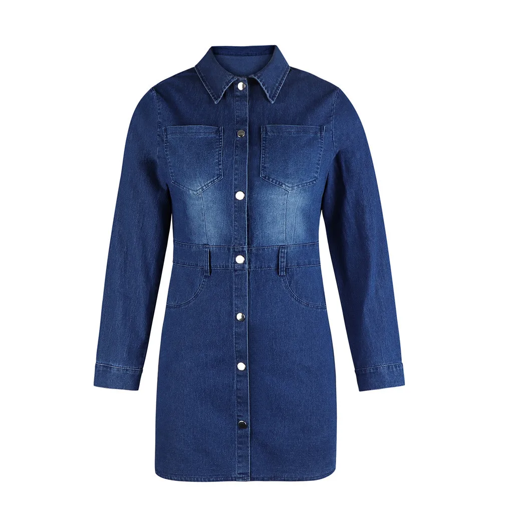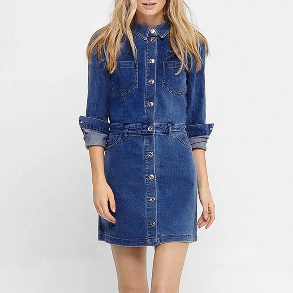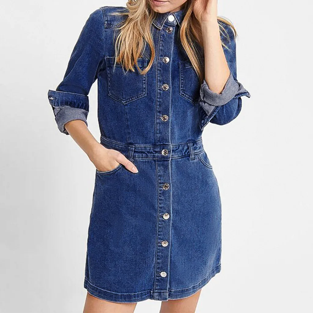 Джинсовое прямое женское платье # S0, с отложным воротником, с длинным рукавом, на пуговицах, элегантное женское повседневное мини-платье для вечеринок, платья