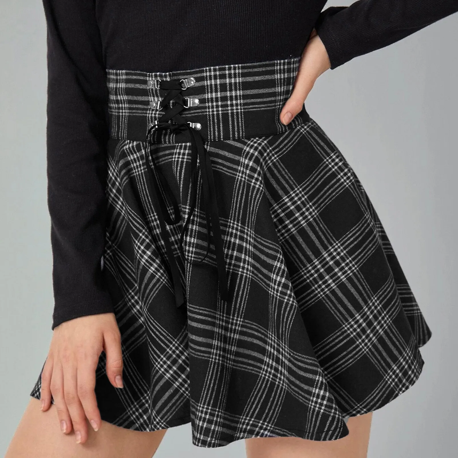 2021 Высокая Талия Мини Готический Юбка со шнуровкой спереди платье трапециевидной формы в клетку в стиле Харадзюку Танцы корейский стиль впитывает пот и короткие панк-юбки Клубная одежда