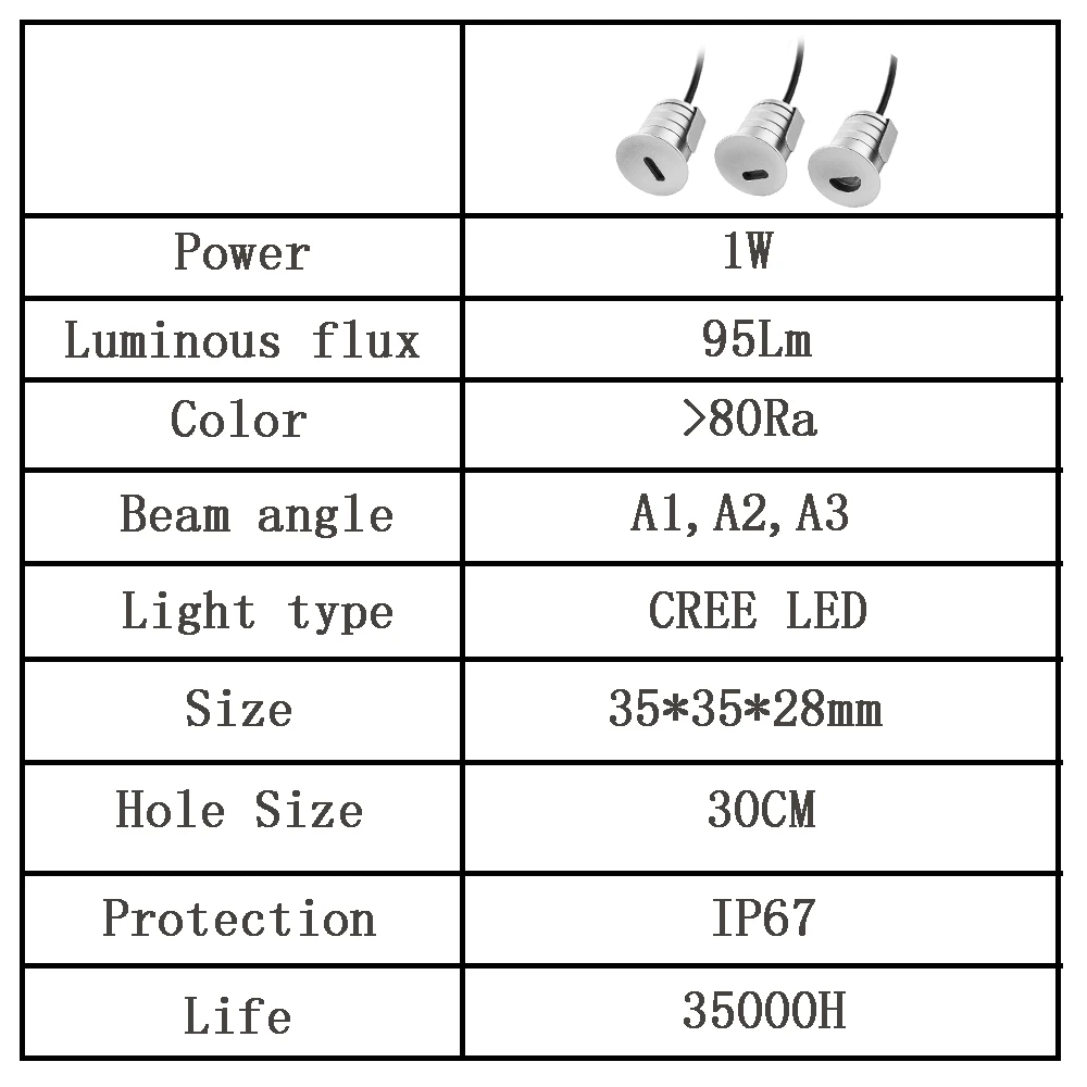 Мощность: 1 Вт Cree чипЛюмен: 95 лмВходное напряжение: AC/DC12V-DC24VСветильник Angele: A1 A2 A3Класс защиты: IP 67Основной материал: алюминийРазмер корпуса: d35 мм x 34 ммРабочая температура: -25 °C ~ + 45 °CКабель: DC12V с водонепроницаемым клеммом 36 смГарантия: 3 года с CE и ROHS, срок службы чипа 35 000 часовЦветовая температура: теплый белый (2700-3000K), натуральный белый (4000-4500K), холодный белый (6000-6500K) другие варианты: красный, зеленый, синийИспользование: входный светильник, дорожный боковой светильник, лестничный светильник, напольный светильник, светильник Conner и другой наружный светильник Venus