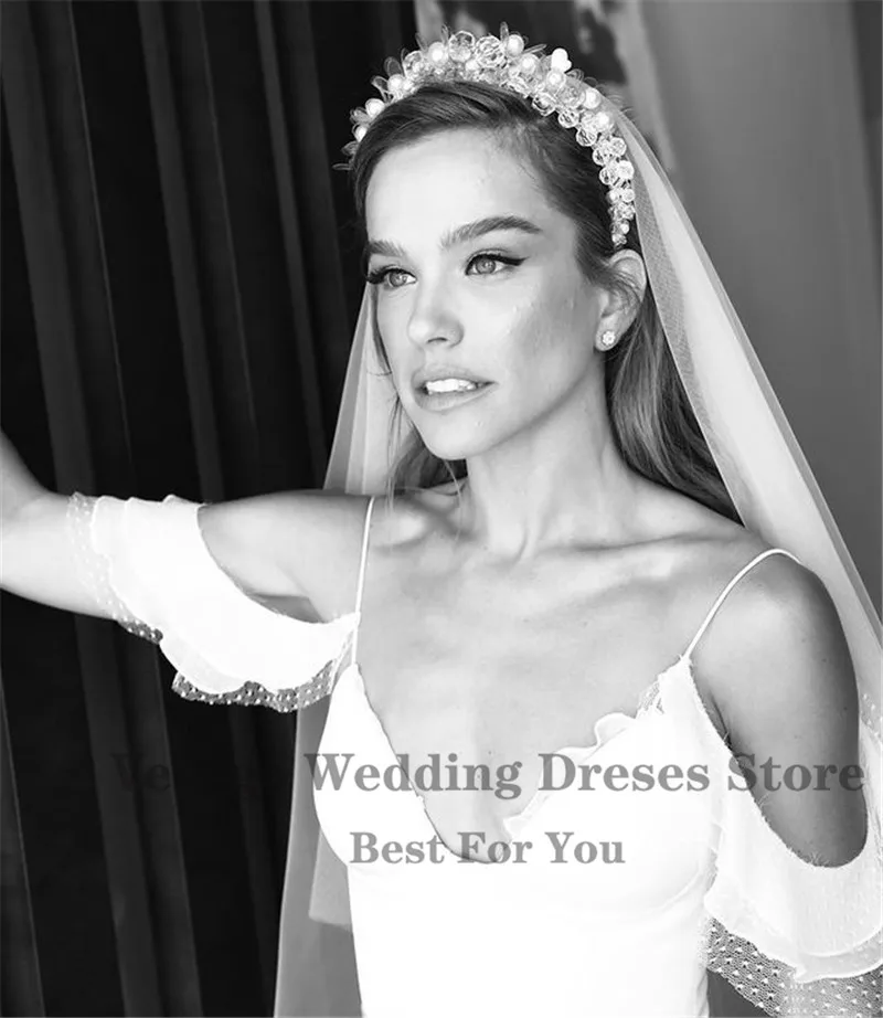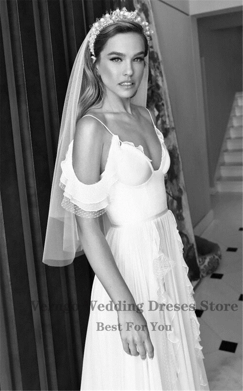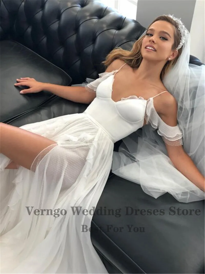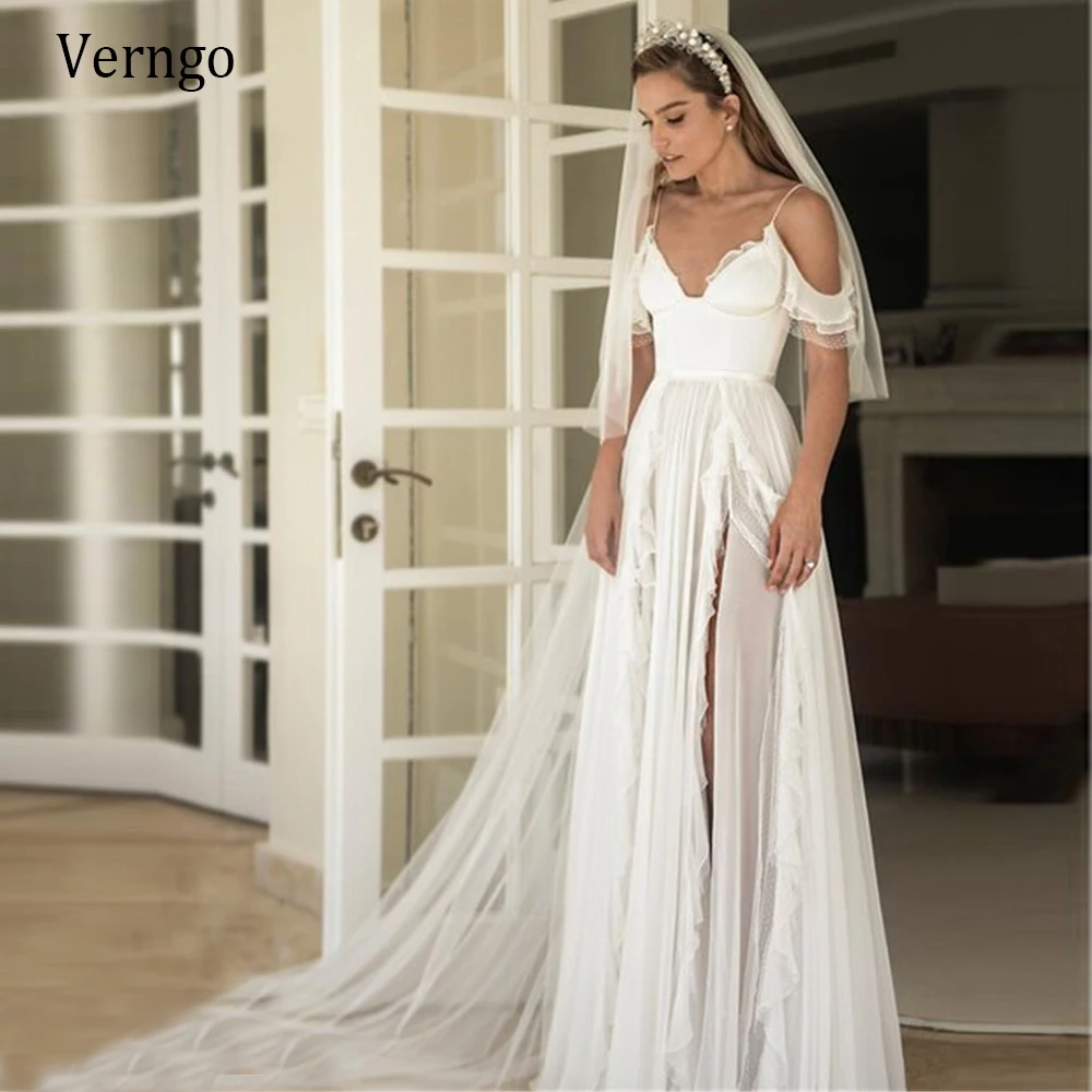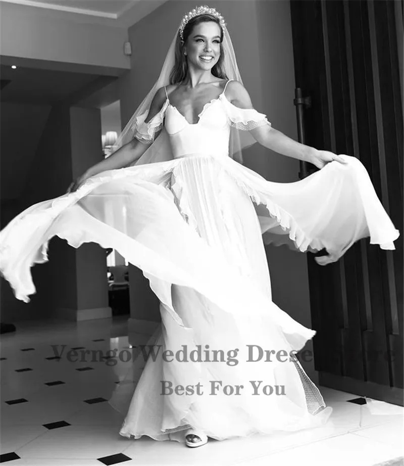 Простое шелковое шифоновое пляжное свадебное платье Verngo трапециевидной формы на тонких бретельках с открытыми плечами и Боковым Разрезом Длинное искусственное