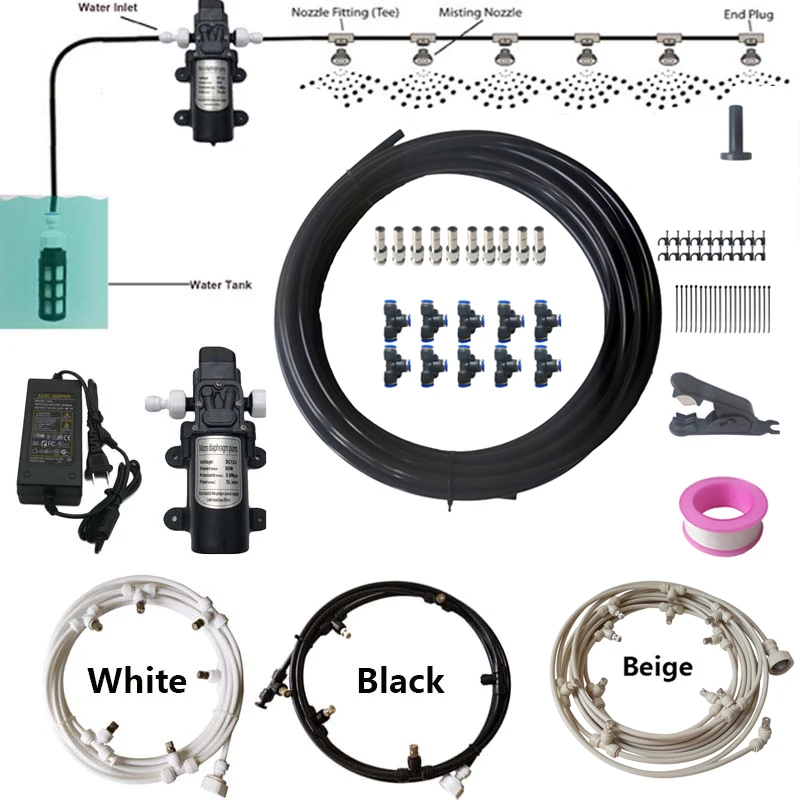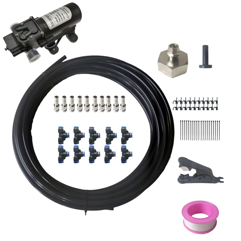 Система запотевания DIY включает: Один насос + источник питания 10х метров 1/4 ''PE трубка 10 X шт 3-полосная тройник разъем 10х шт быстрое вставное сопло 1 шт. резак для труб 20 шт. Трубная пряжка 20х шт пипловые Галстуки 1 шт. Торцевая вилка 1 шт. тефлоновая лента 1 шт. соединитель смесителя
