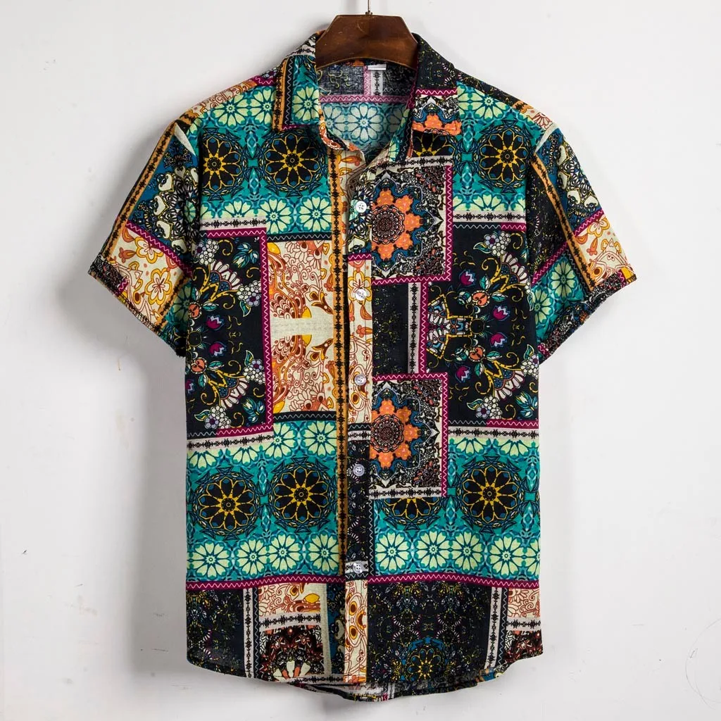 Модная Повседневная цветная мужская хлопковая льняная рубашка, свободная Гавайская летняя футболка с короткими рукавами и принтом на пуговицах, хит продаж 2021, футболка